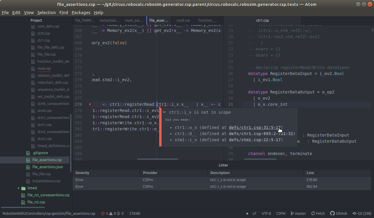 I've also added support for parsing other error messages generated by FDR, inserting clickable links on messages containing .csp file paths. Screenshot with example below: