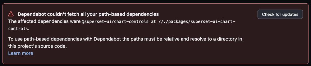 Absolute path dependencies can never be resolved by Dependabot and are resulting in EACCES errors when it tries to create files in various places around the update container that it doesn't have access to. For instance there are a considerable amount of errors trying to create
