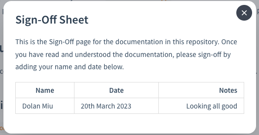 This plugin is an effort to create relevant, up to date documentation for your project. It is a simple plugin that adds a sign-off sheet to your docs. It is a simple way to ensure that your documentation is up to date and relevant.