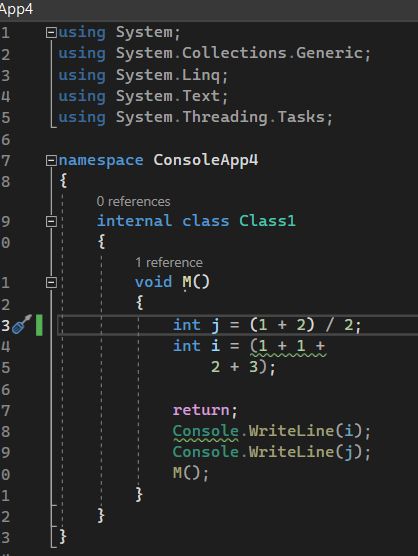 In the screenshot, usings and unreachable code are fully faded. Unnecessary parens fades the parens and warns on the first line when configured to warning severity.