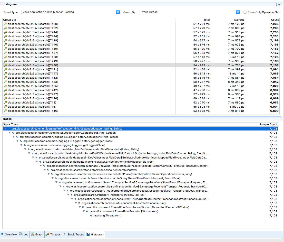 Each doc value fetch will essentially create an instance of DocValuesIndexFieldData class, which will create a logger object in its constructor. However in PrefixLogger class, there is a synchronized block around marker which will block the initialization of DocValuesIndexFieldData class. We noticed a lot of thread block in PrefixLogger from JFR recording, which we believe is the root cause for super long ParNew GC: