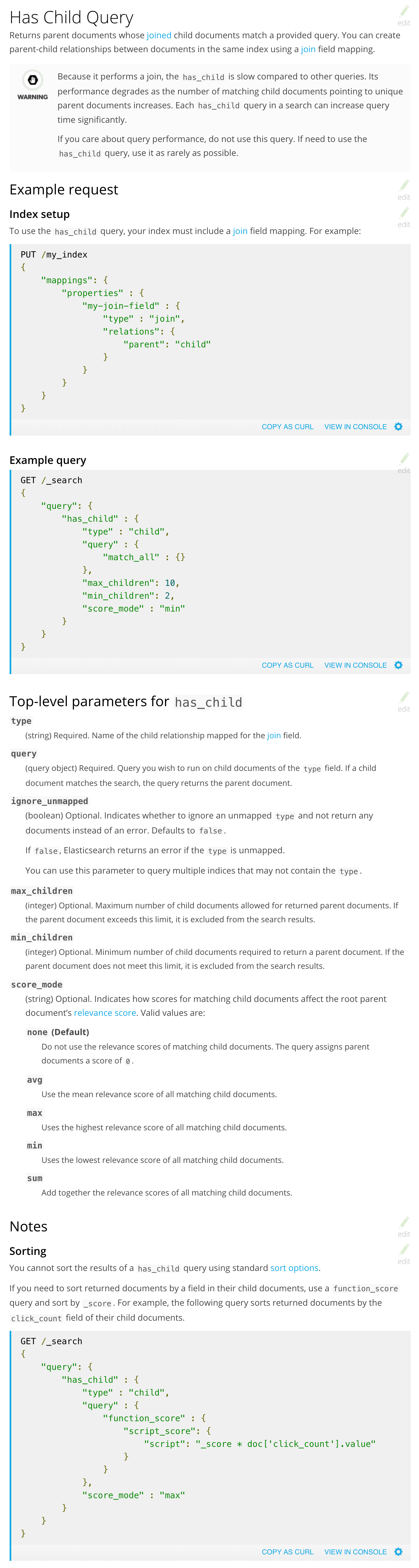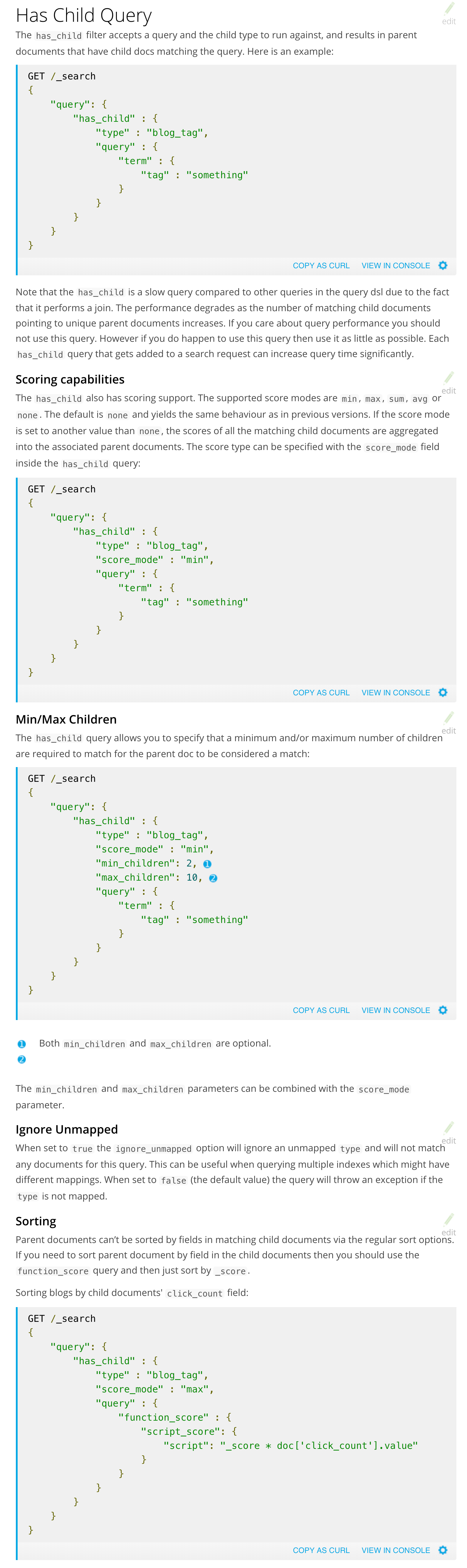 | unique parent documents increases. Each `has_child` query in a search can | ||