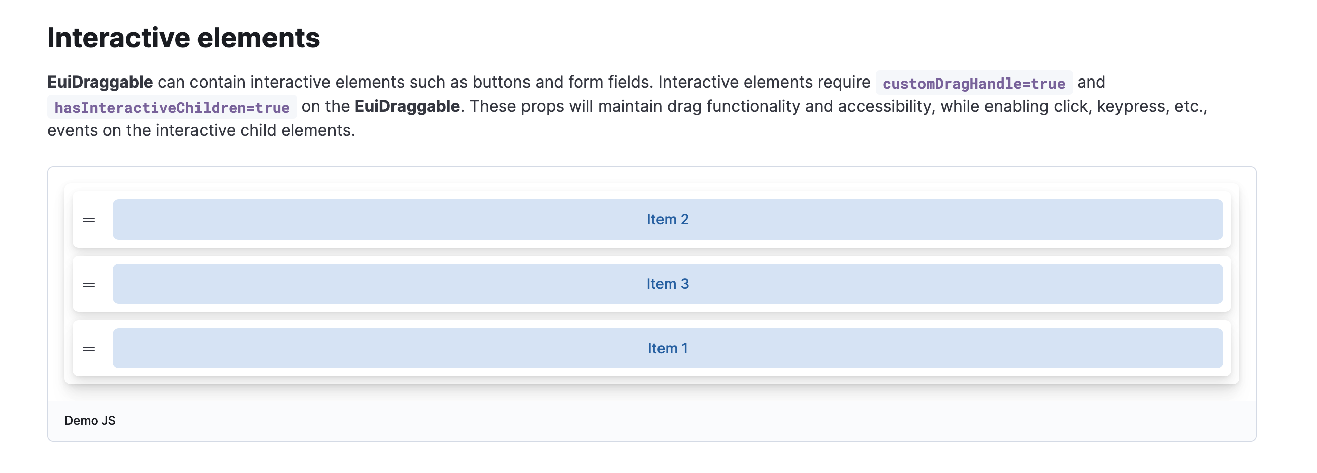 If we go for this suggested change I would also consider changing the Custom drag handle example to use the <EuiPanel /> instead of a <div />. So both examples, Custom drag handle and Interactive elements would have similar elements.