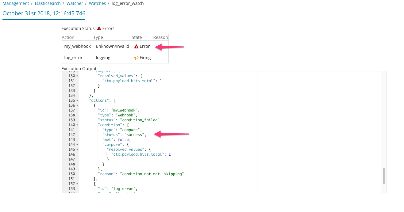 - Step 2: Add 1st and 2nd documents to the logs index to satisfy the watch condition - both actions should fire successfully: