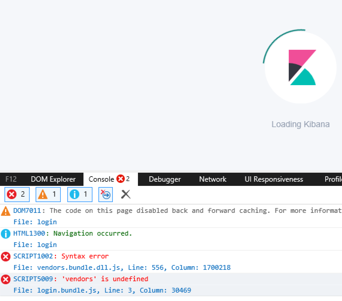 Expected behavior: Kibana should load (and should show "your browser doesn't meet Kibana security requirements" message).