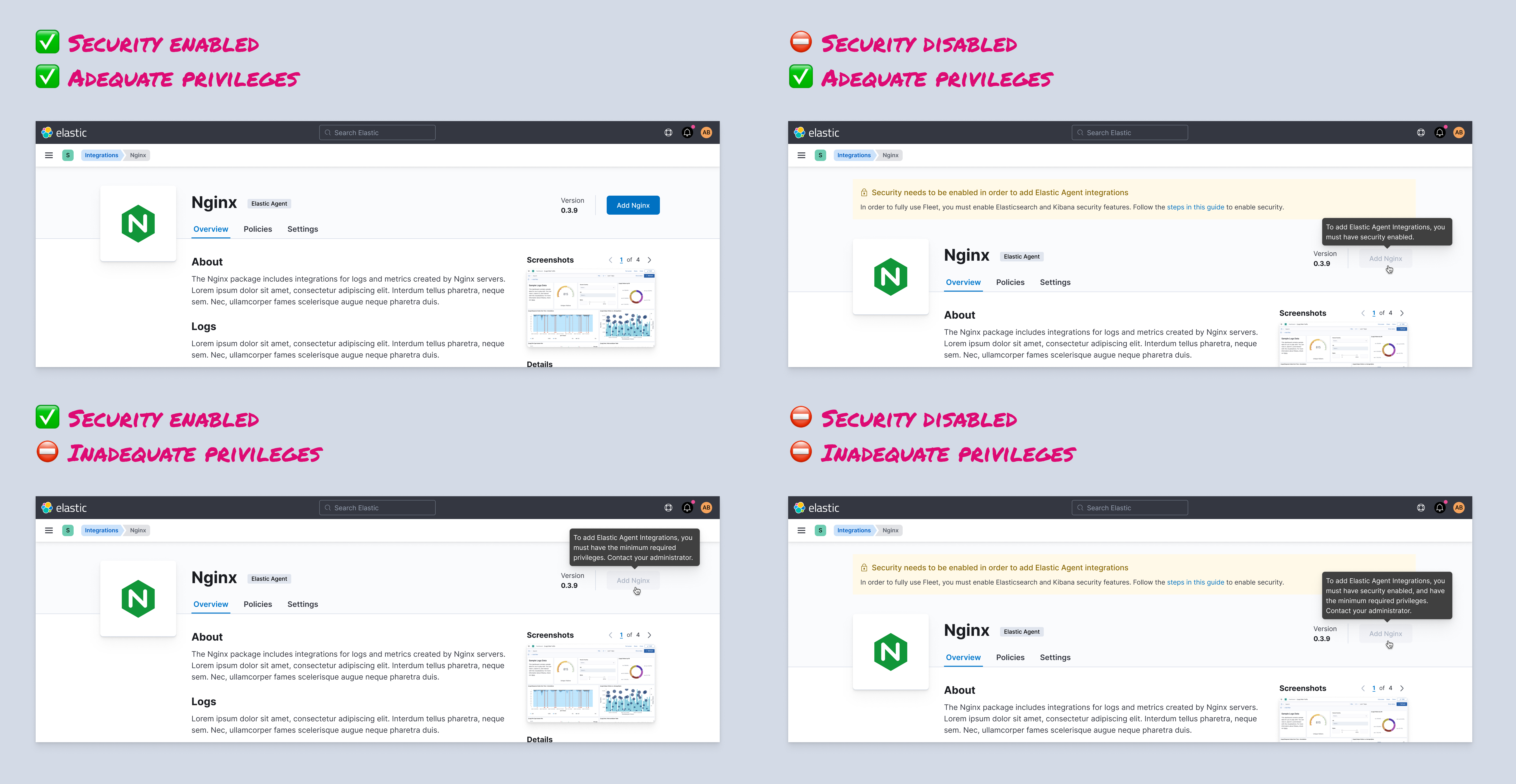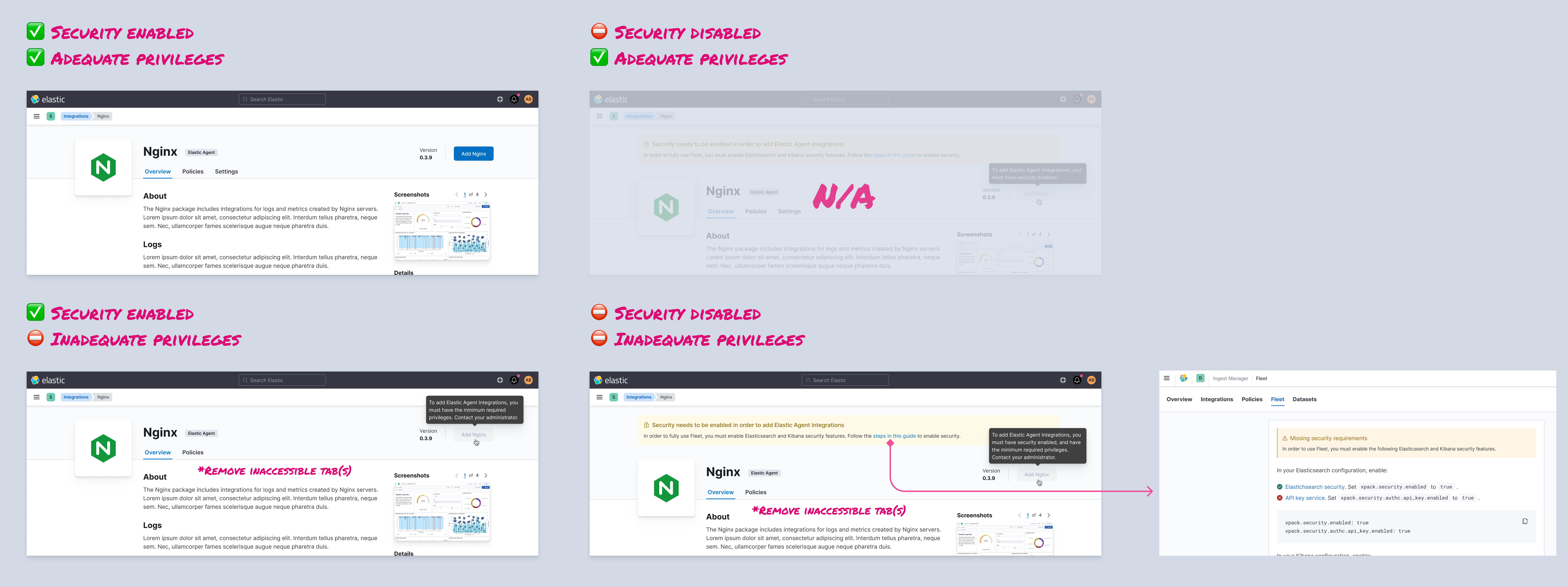 @joshdover I think if security is disabled then they cannot log in as a superuser role, so the top right use case is not possible. The bottom left indicates the next step they need to take. I think it'd be fine to link to Fleet to show the dialog. We need to make sure the two checks align so the user doesn't get redirected and see nothing. |