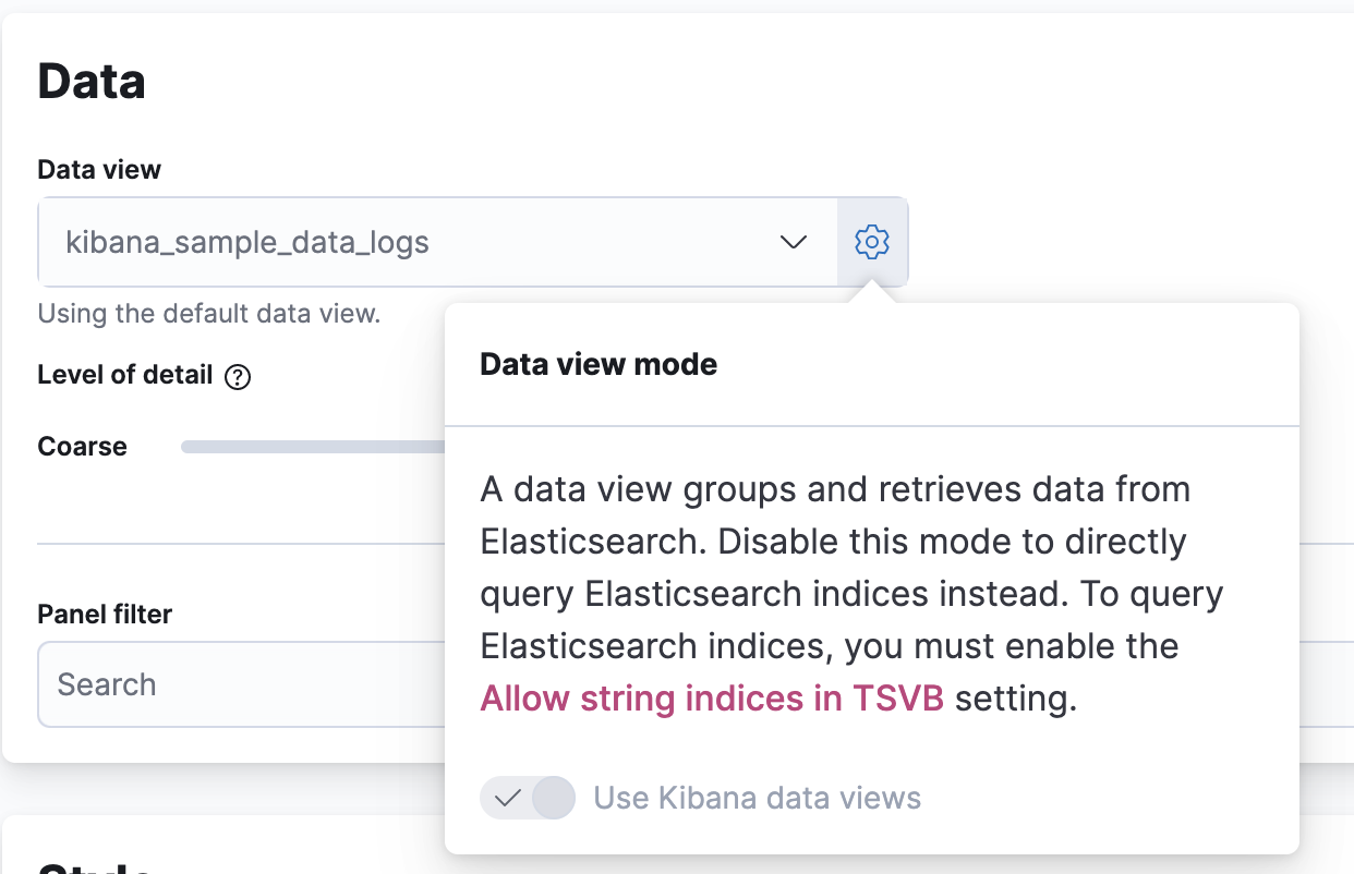 The TSVB data view popover includes additional copy if the Allow string indices in TSVB Kibana setting is disabled (the default). This updates the copy to better align with changes in #110253.