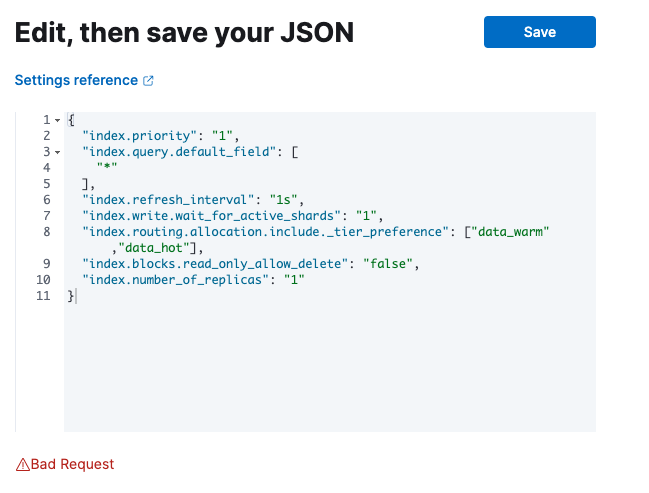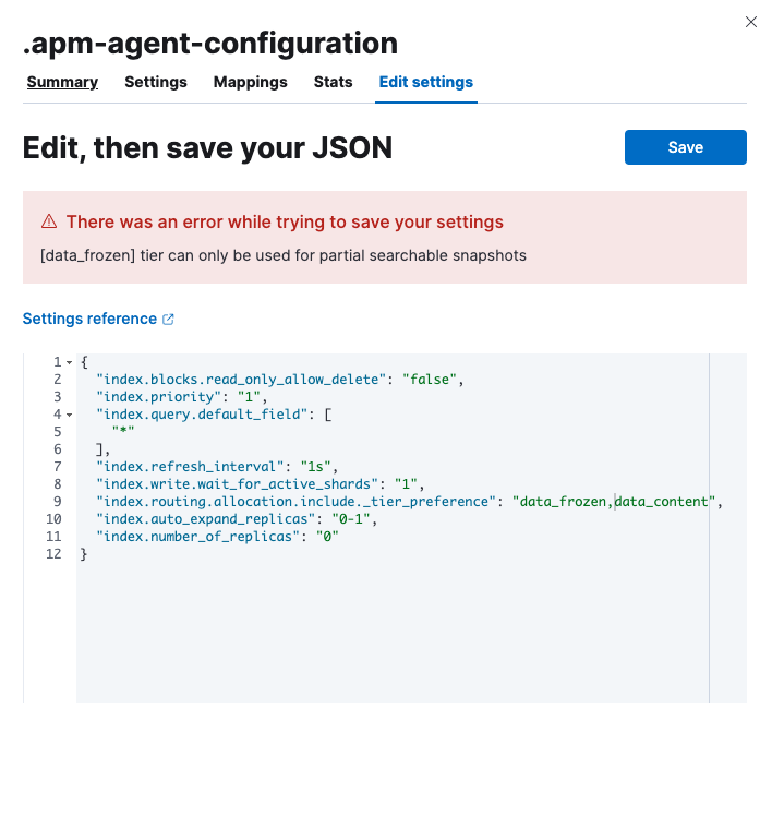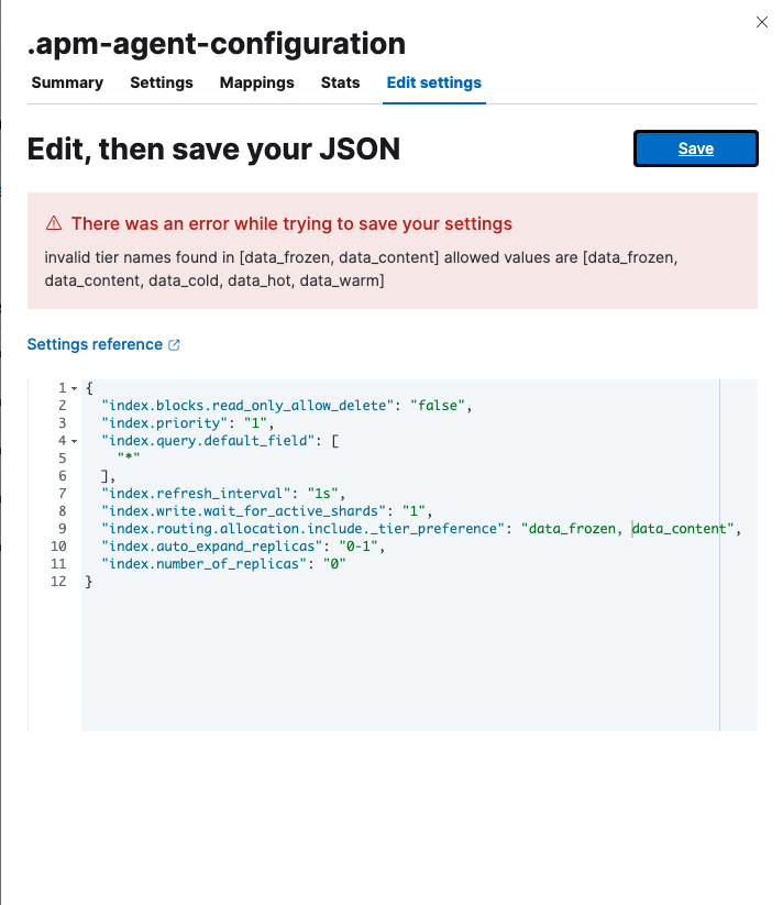 yarn es snapshot --license=trialyarn startStack Management->Index Management-> open the flyout of any index and go to theEdit settingstabindex.routing.allocation.include._tier_preferenceto"[data_content]"Screenshots