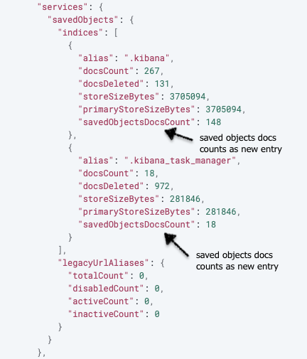 core-usage-stats-serviceinkibana.ymlas described abovecluster statsto see an example of the data Kibana collectssavedObjectsunderservicesin the flyout and observe that we report thesavedObjectsDocsCountas another entry per index.core-usage-stats-servicelogs and observe we have two entries for docs counts: one for the Lucene document count and one for the saved objects document counts.Checklist