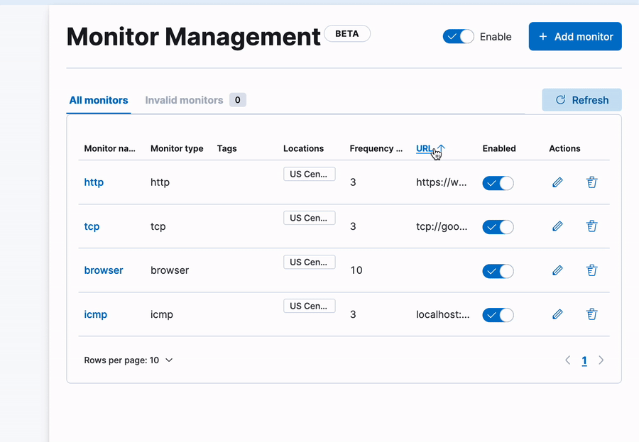 Enable Monitor ManagementTypecolumn heading. Ensure that monitors are sorted by typeURLcolumn heading. Ensure the monitors are sorted byurl. Note: There is a known bug where sorting does not work correctly for tcp and icmp monitors. Issue is pending.Namecolumn heading. Ensure the monitors are sorted by name.