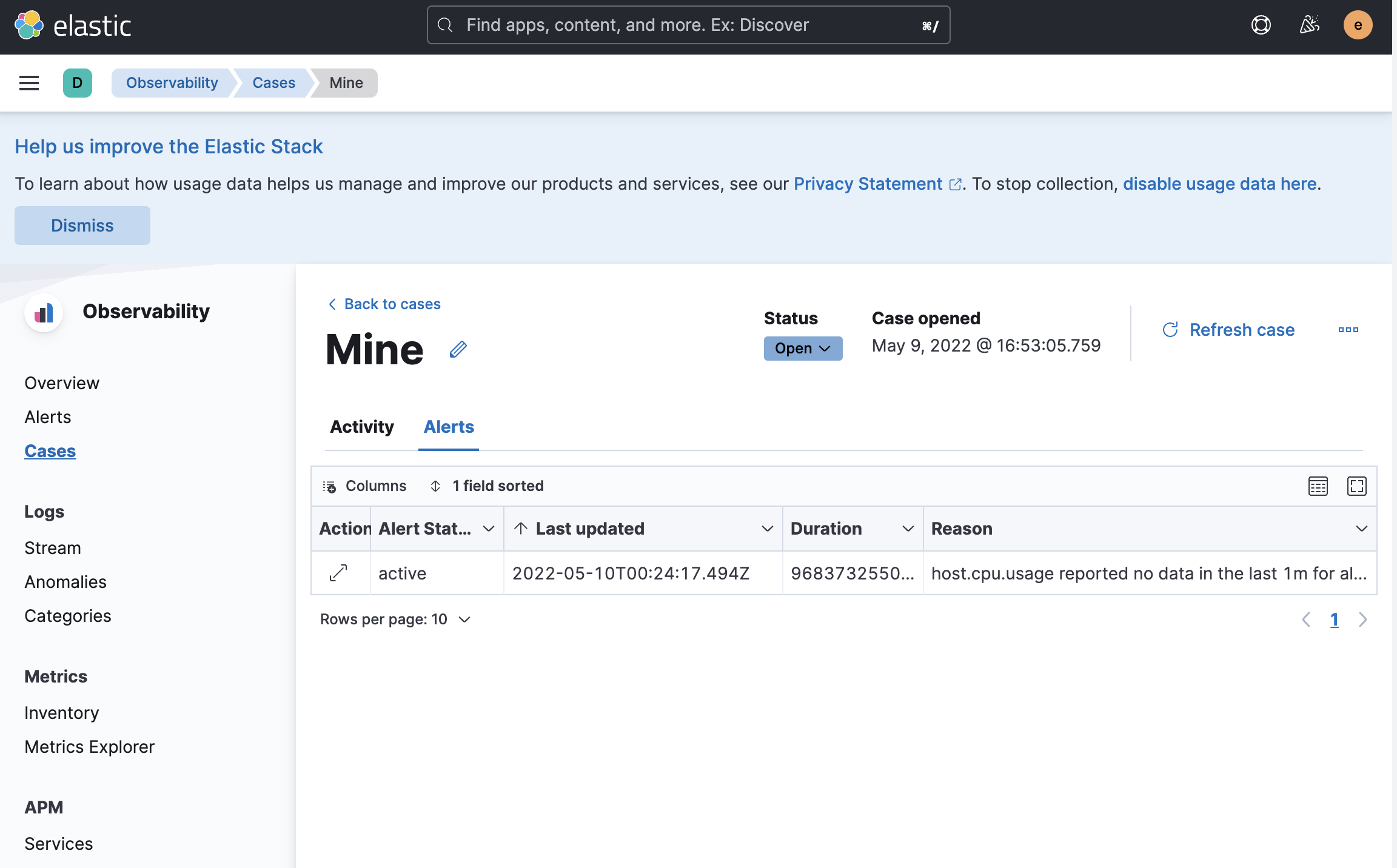 View all alerts attached to a case in the alerts table. The feature is experimental.