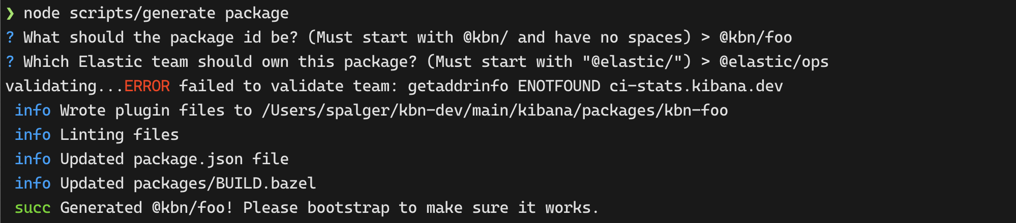 node scripts/generate packagenow asks for the name of the package interactively when not specified on the command line."owner"field inkibana.jsoncis required to be a string starting with@and is injected into the codeowners file as the default codeowner for the package. This will enable code-ownership of many packages which currently don't have an owner, and will allow us to validate the owners in a "soft" way by leveraging the codeowners validation that Github provides. The values of these"owner"fields were based on the existing codeowner entries, text-based owner values in package.json files, and in a few cases the package id.node scripts/generate packagewill interactively ask for an owner if it's not supplied on the command line. The owner is then validated and suggestions are provided when the value isn't an actual team in the@elasticorg.--ownerCLI flagkibana.devOnlyflag from the package.json file to thekibana.jsoncfile. This field determines if the package should be in the deps or devDeps, and whether the package can import devDeps or not. This field is now feeding into the eslint config properly and doing import checking in places which were previously broken. These fixes led to the following packages being moved to "devOnly":@kbn/apm-synthtrace@kbn/eslint-plugin-disable@kbn/eslint-plugin-imports@kbn/kibana-manifest-schema