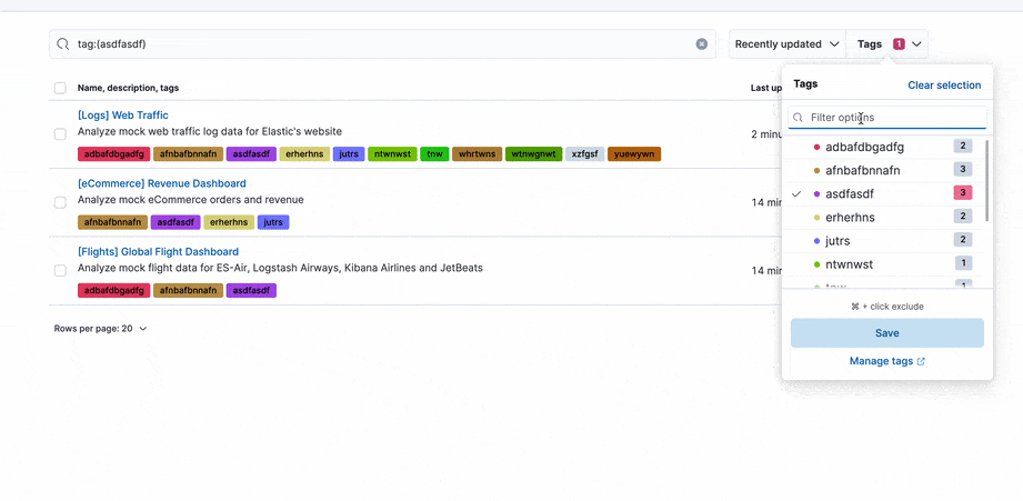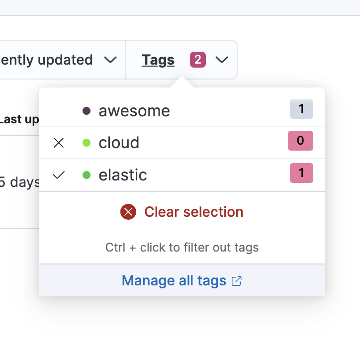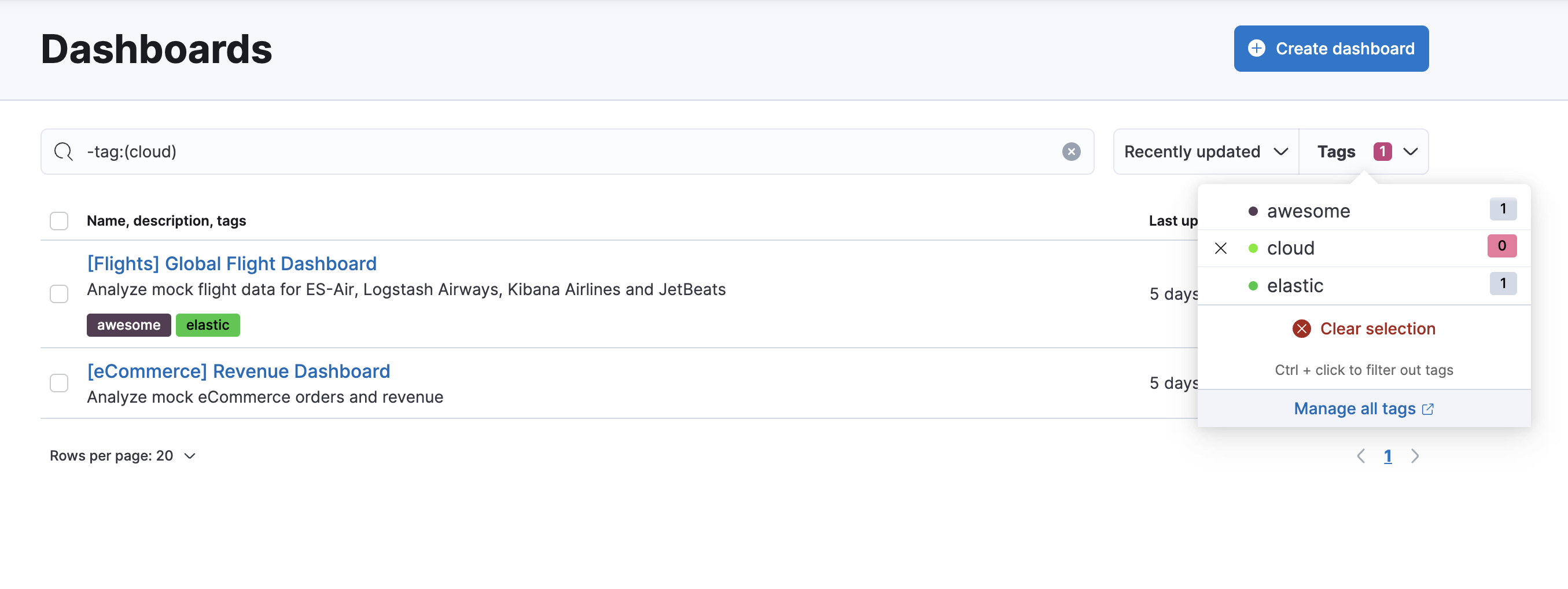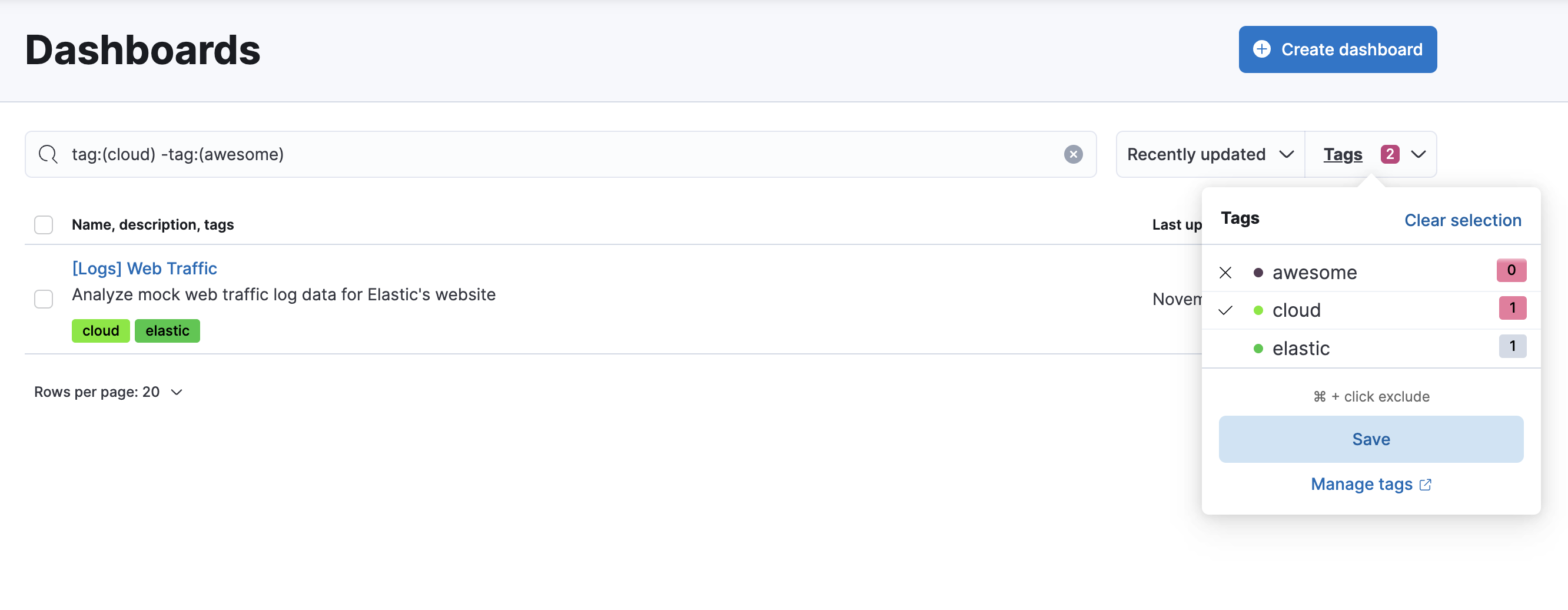The dashboard, visualize library and maps listing pages have been updated with an enhanced tag filtering. The new filtering allows tags to be either included or excluded from the search.