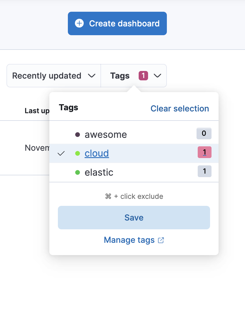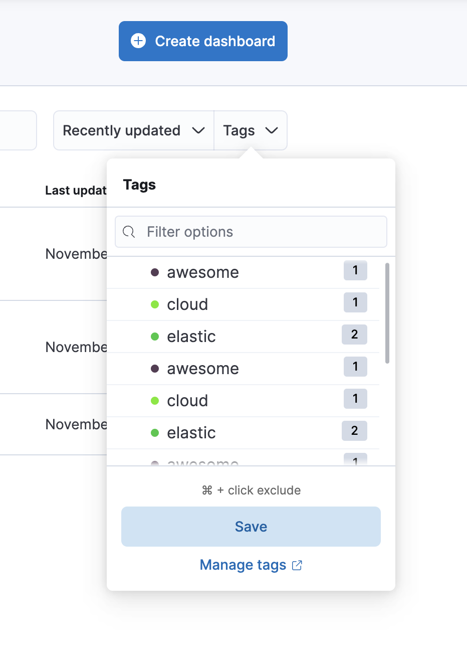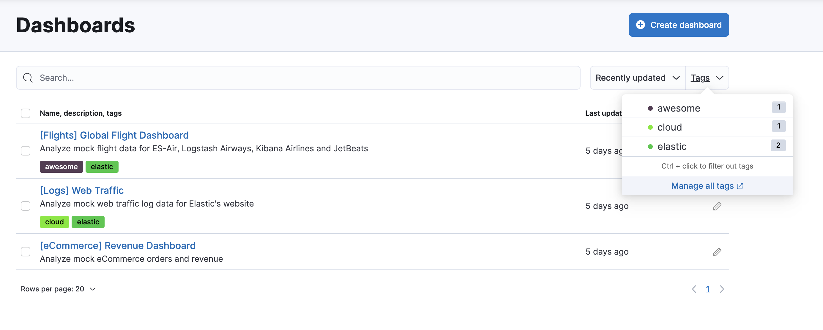 The dashboard, visualize library and maps listing pages have been updated with an enhanced tag filtering. The new filtering allows tags to be either included or excluded from the search.