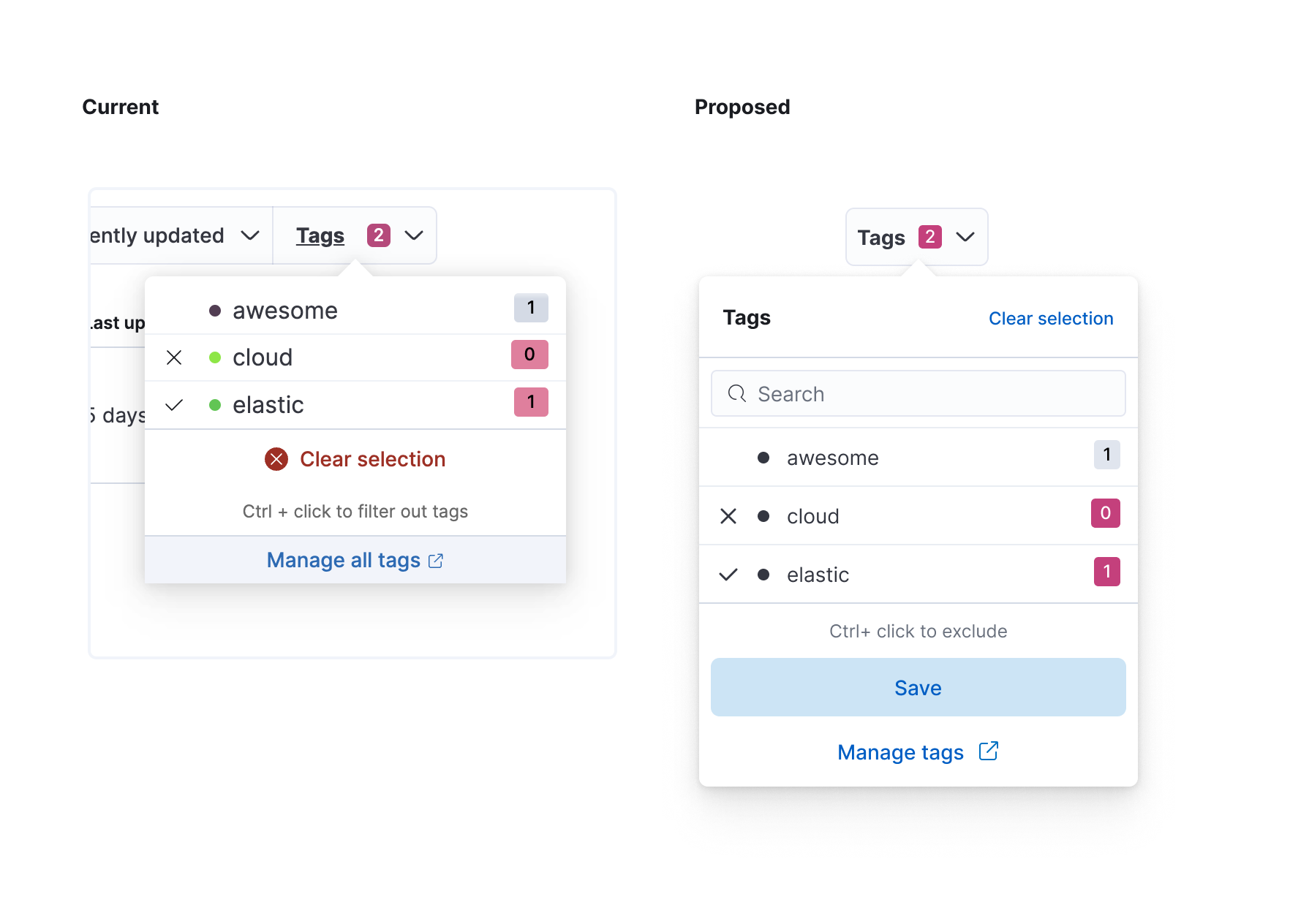- Note that I updated the copy for 'Ctrl + click to filter out tags' to 'Ctrl + click to exclude'. We use 'Exclude' in the search bar, so I'd recommend doing the same here. Also removing the word 'tag' here—don't think it's necessary and if we want to reuse this elsewhere, we don't have to worry about updating that text to match.