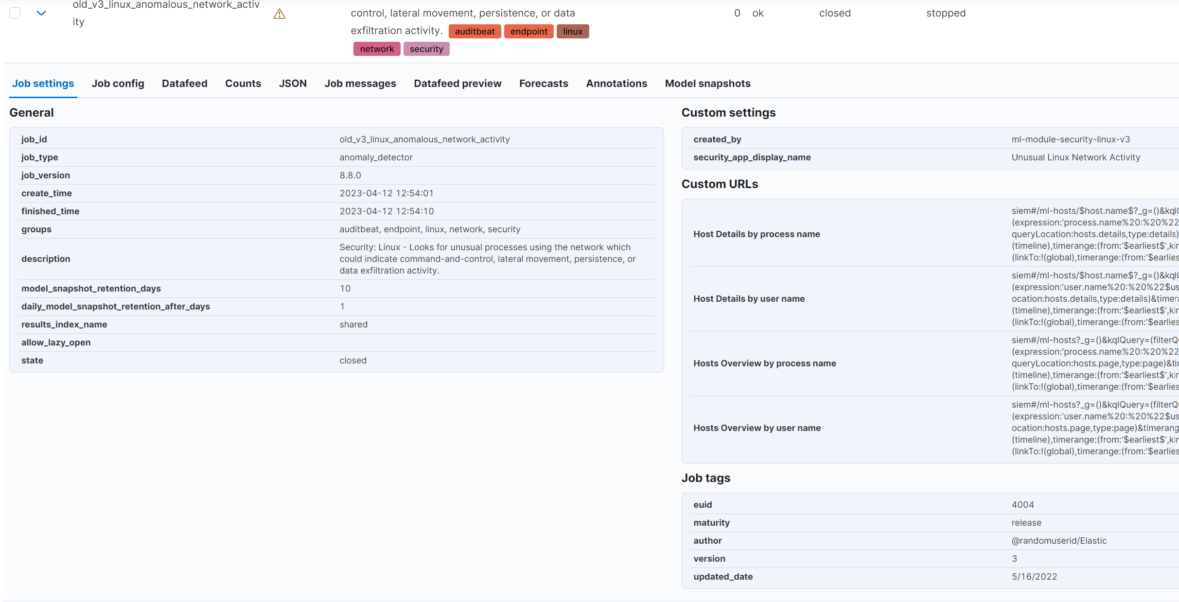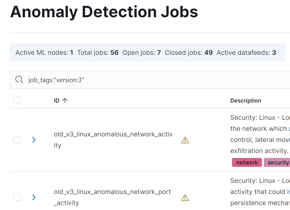 security-packetbeatcompatible with Agentdetector_descriptionfield for almost all jobsjob_revisioncustom setting similar to the Logs jobs. Moving forward, this number will be updated each time a job is updated. We are starting with 4 since thelinuxandwindowsjobs are at v3 right nowmanaged:truetag to indicate that these jobs are pre-configured by Elastic and so users will see the warnings added in this PR if users choose to delete, or modify these jobs