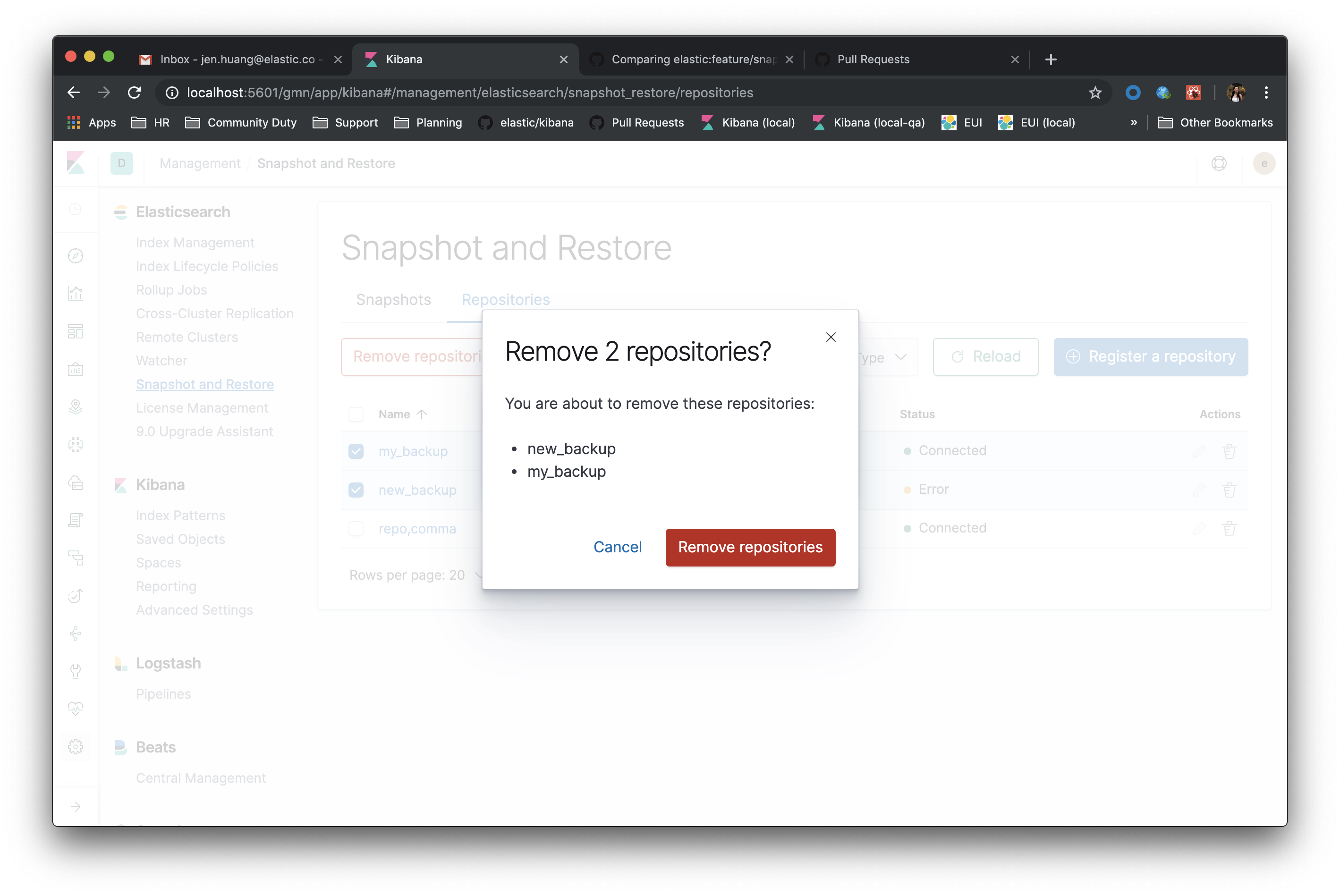 Confirmation modal for multiple delete by selecting repositories from table: