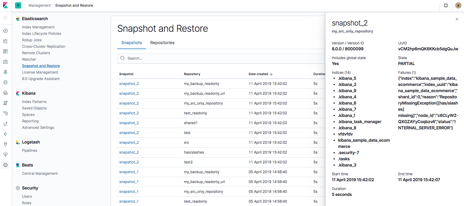 * [SR] Snapshot and restore plugin boilerplate (elastic#32276) * Initial plugin set up * Set up client shell * Add initial repository list routes * Fix merge issues and some typings * Decouple server from plugin.ts files, tighten up typings * Use exported constant for required license * Translate plugin name, more typings * Fix more types, move list components under /home * Remove unused var * Change scss prefix * Uncouple unmount logic from routing shim, and some other PR feedback * [SR] Repository list and details UI (elastic#33367) * Initial pass at repositories list UI * Add detail panel for file system repositories, and a generic detail panel with json settings view * Add detail components for other types * Add detail panel footer, rename `useStateValue` to `useAppState` * Fix detail panel footer * Fix unused vars * PR feedback * PR feedback * [SR] Refactor proposal (elastic#33690) * Move app dependencies to its own context provider * Add index.ts barrel file for common types * Move Enums to constants.ts file * Refactor function component using `React.FunctionComponent<Props>` * Refactor service folder structure * Fix type import * Move REPOSITORY_DOC_PATHS from common to public constants * Move AppCore and AppPlugins interfaces back to shim and re-export them from app types * [SR] Create and edit repositories UI (elastic#34020) * Add routing and placeholder form * Fix typings * Set up edit repository route, and basic form UI * Add typings for wrapCustomError, and copy extractCausedByChain from CCR wrapEsError * Throw errors that are already boomified * Create and edit for basic repository types (fs, url, source) * Add repository verification UI to table and details * Create and edit for plugin repository types (hdfs, azure, s3, gcs) * Fix linting * Fix test * Fix test * Remove unused import * Fix duplicate i18n key * Fix details opening on cancel edit, remove unnecessary Fragments, definition file for some EUI components to x-pack, rename saveError * Remove breaks * Adjust add and edit repo routes so they don't conflict with list route * Add repo plugin and types doc links to form * Bootstrap documentation service * Bootstrap text service and replace RepositoryTypeName component with it * Bootstrap breadcrumb service and replace usages * Bootstrap httpService, remove chrome and http from app dependencies(!) * Add request creator and replace all instances of useRequest and sendRequest with it * Fix typo * Simplify update repository and update repository setting methods * Adjust copy * Lint * Remove unused var * Remove unused import * [SR] Add API for retrieving snapshots. (elastic#34598) * [SR] Single and multiple repository delete (elastic#34593) * Add single/multi repository delete API and UI * Address PR feedback * [SR] Add SnapshotTable and SnapshotDetails. (elastic#34837) * Remove associations between multiple repositories with a single snapshot. * Retrieve complete snapshot details in getAllHandler. * Fix cleanup function bug in useRequest hook. * Fix bug in useRequest which prevented old data from being cleared when subsequent requests returned errors. * Add initialValue config option to useRequest. * Add formatDate service to text module. * [SR] Fix linting and add (de)serialization for repositories (elastic#35031) * Fix eslint issues and add (de)serialization for repositories * Add comment about flattening settings * [SR] Surface repository errors and index failures more prominently (elastic#35042) * Add links to repositories from Snapshot Table and Snapshot Details. - Rename services/breadcrumbs to services/navigation and add linkToRepository function. - Refactor home component to update active tab when URL was changed. * Add warning callout to let user know when their repositories contain errors. * Sort failures by shard and add test for snapshot serialization. * Sort failures and indices. * Add filter for filtering snapshots by their repository. * Surface states with humanized text, icons, and tooltips where necessary. * Fix pluralization of seconds. * Surface failures tab even if there are none. - Display a '-' for missing times and durations. - Create DataPlaceholder component. * [SR] Polish repositories UX (elastic#35123) * Refactor repository detail panel to load repository based directly on route param. * Display repository detail panel while table is loading. * Make 'Edit repository' table action a link instead of a button. * Render disabled EuiSelect as a readonly EuiFieldText. * Prepend HDFS URI with hdfs:// protocol. * Present scheme options for Read-Only URL repository as a select. * [SR] Add client-side validation to repository form and link to snapshots from details (elastic#35238) * Add client side repository form validation, extract `flatten` into common lib * Add snapshot count to repository details and link to snapshot list * Reset validation when changing repository type * Fix snapshot list filter deep linking for repository names with slashes and spaces * Fix imports * PR feedback * [SR] Design and copywriting fixes (elastic#35591) * Split repository form into two steps; move `clean_settings.ts` to server * Default to snapshots tab, adjust snapshot empty prompt, add app description * Add minimum timeout to list view requests to avoid flicker, use EuiEmptyPrompt for loading screen, add doc link to settings step * Add information about snapshots to delete repository behavior, add doc link for source only toggle, add size notation help text * Add main doc link * Copywriting and i18n fixes, and add some common settings to third party repo types * Add fields to third party repo detail panel * More copywriting fixes * Use spinner for duration and end time if snapshotting is still in progress * Show all repository type options, mark missing plugins * Revert "Show all repository type options, mark missing plugins" This reverts commit e34ee47. * Fix space * [SR] Add permissions UI and Cloud-specific repository type UI branch (elastic#35833) * Add missing permiss