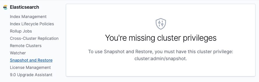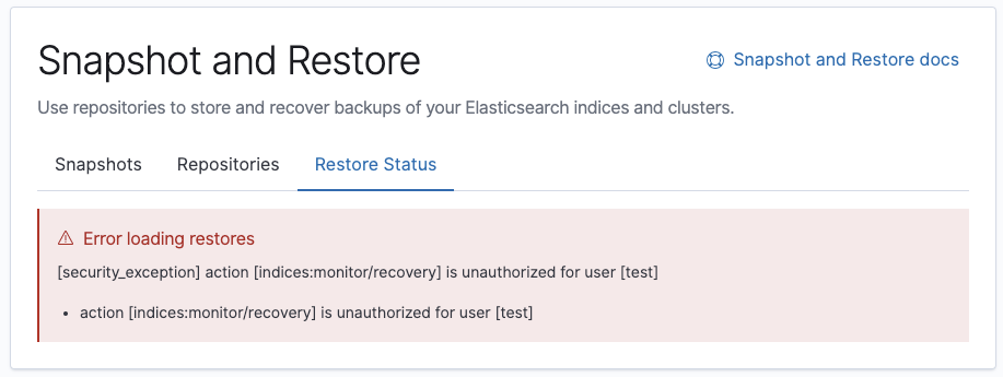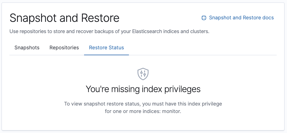 monitor. Not having this privilege on at least one index will not block the user's access to the app, but will block the Restore Status content from being shown. Prior to this PR, the UX was not very nice:Testing