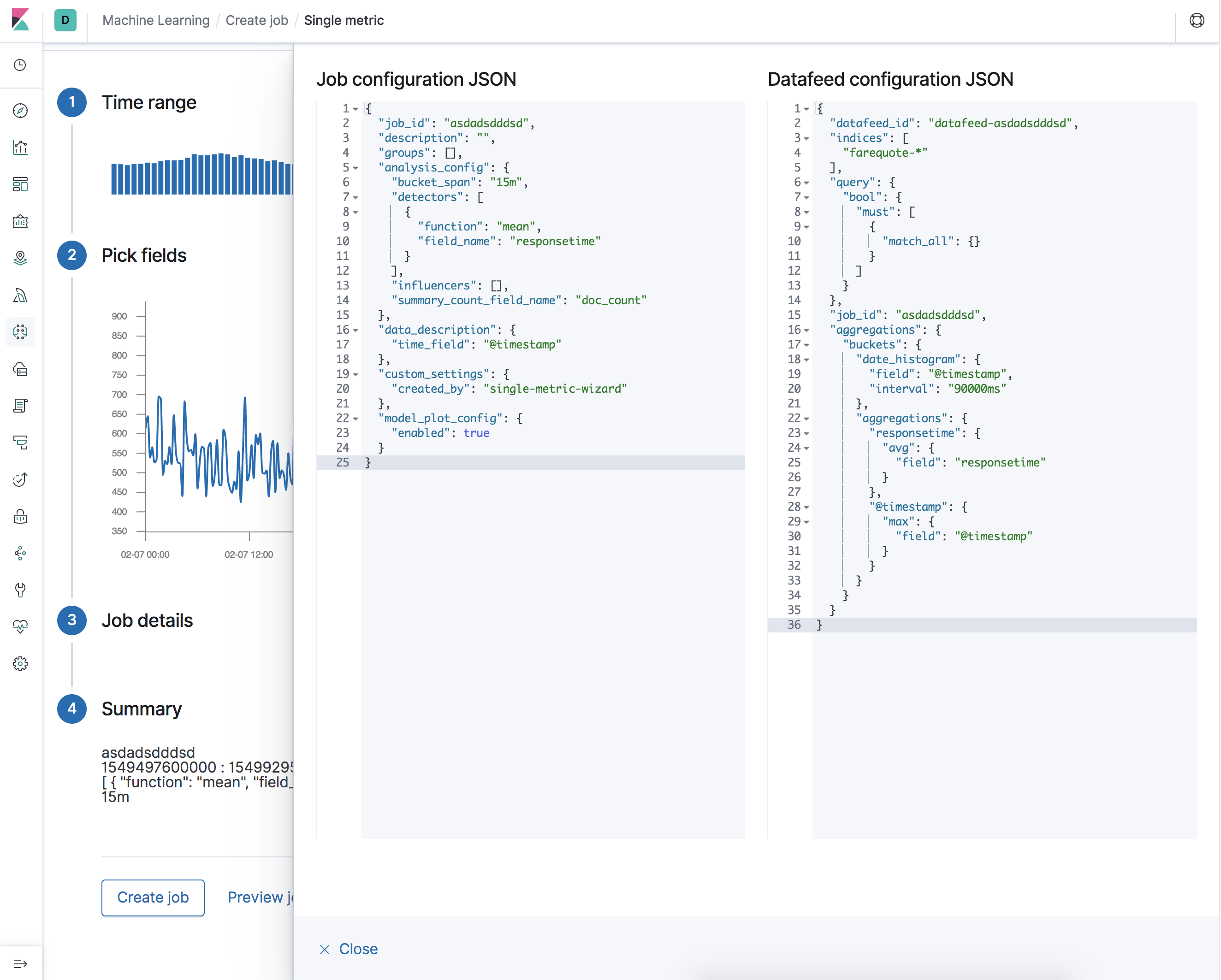 Preview job JSONbutton to the summary stage, opens job and datafeed config in a flyout.Note, this is useful for testing, feature may not make it into the final version.