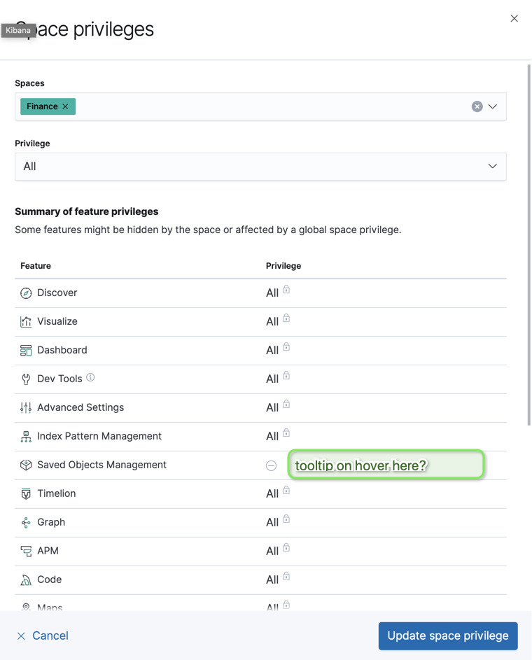 - Edit the space privilege from step 2, and try to set Saved Objects Management to "None"