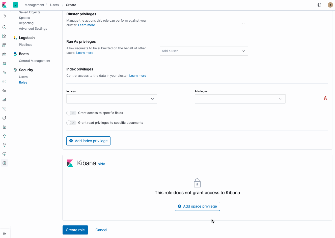 - On the create role screen, add a space-specific privilege, setting Saved Objects Management to either "all" or "read"