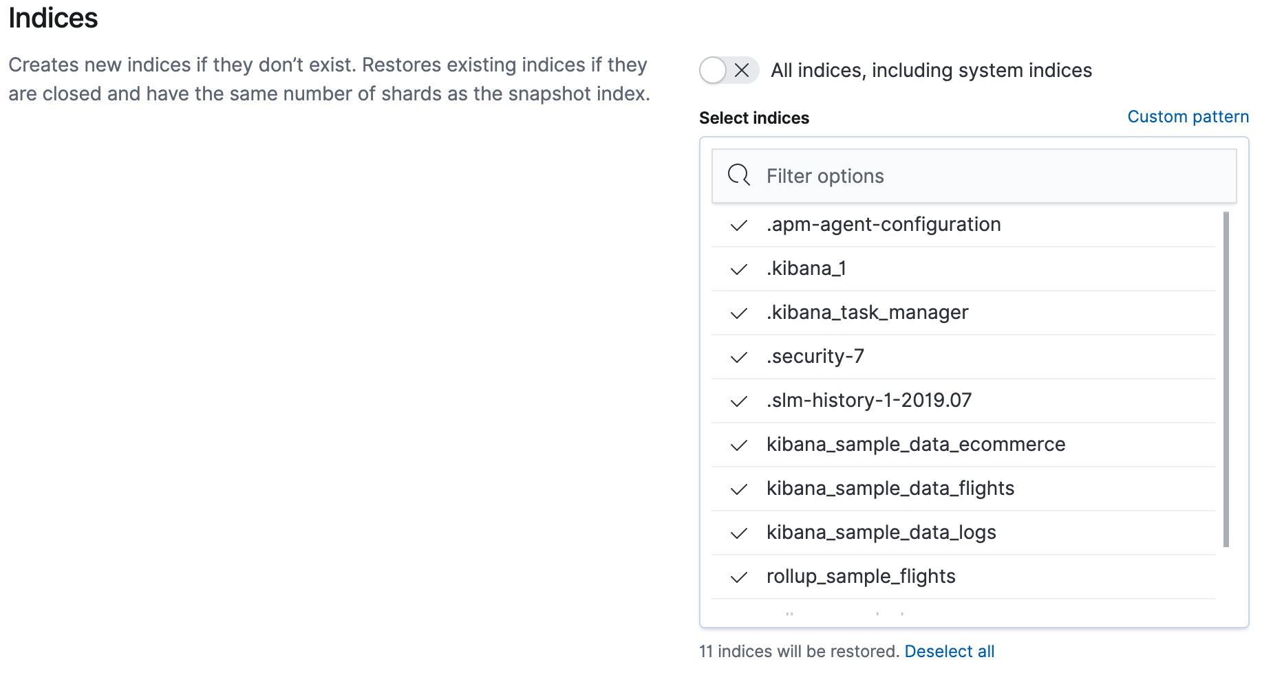 With this PR, there is a now a toggle link when the user turns off All Indices. By default, if the snapshot to restore has <= 100 indices, the selectable list will display. If the snapshot to restore has > 100 indices, the custom pattern input will display. The custom pattern input does not do validation against the available indices, so ES error will surface on Review page if it is invalid.