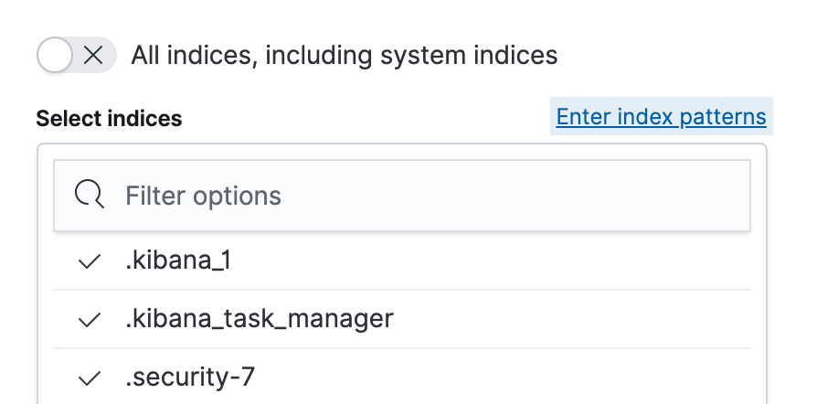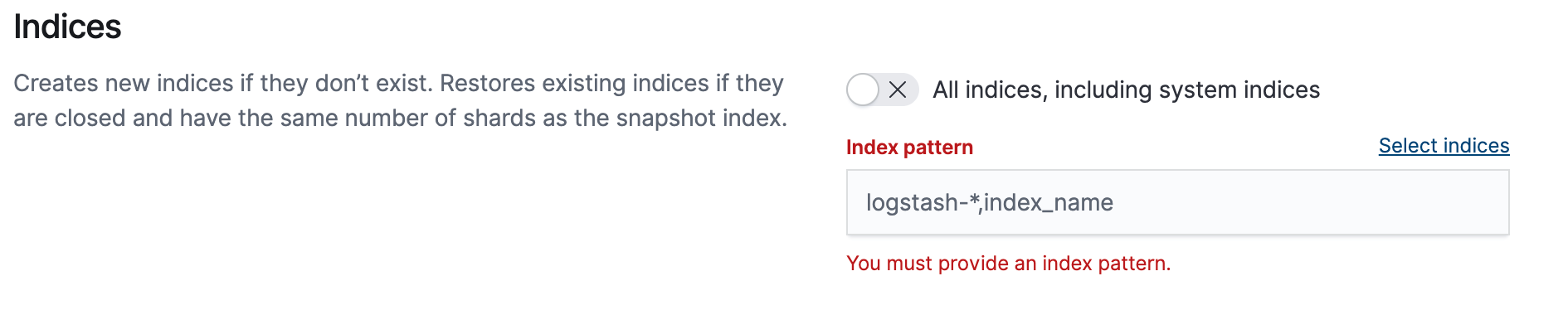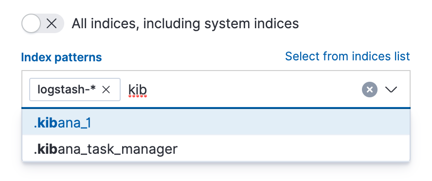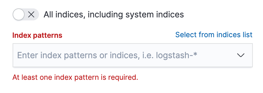 | placeholder="Enter index patterns or indices, i.e. logstash-*" |