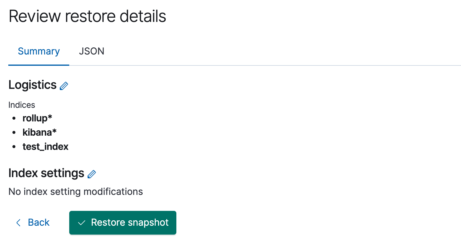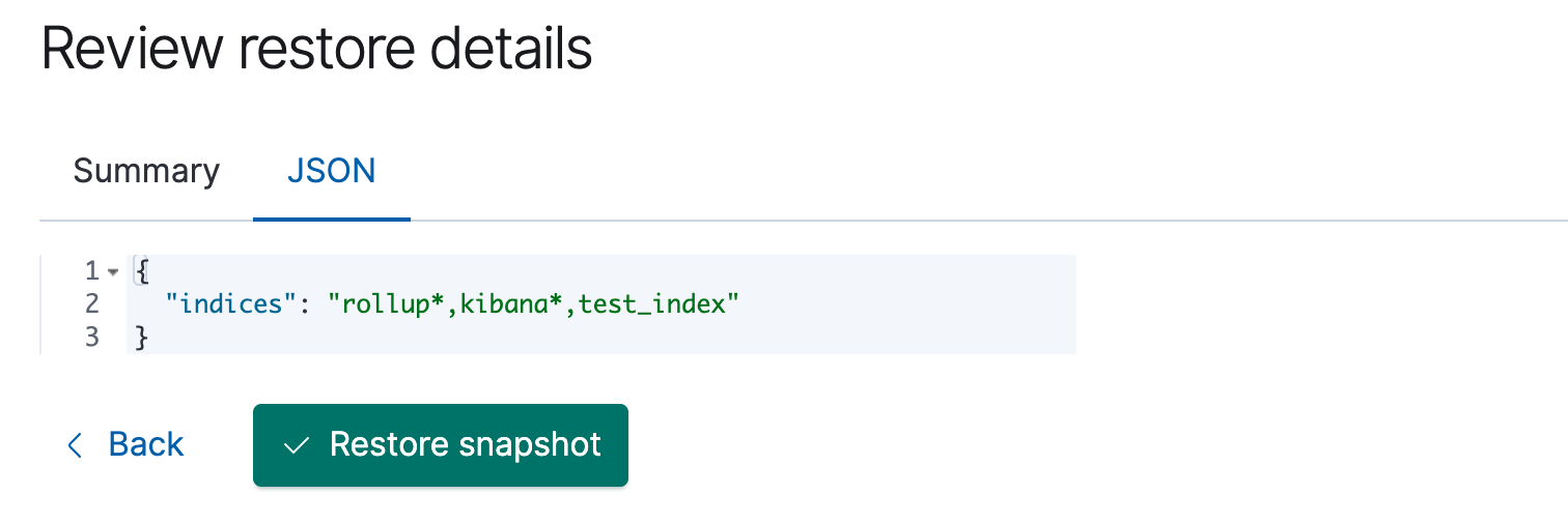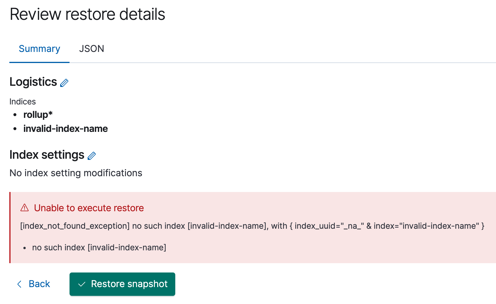 We typically use this format for validation on fields: An index is required. Make sure this format is consistent with the rest of the UI (i.e. that the validation on the Name field is "Name is required."_ Also, for the message on the review page, is it possible to change the heading to "Unable to restore snapshot."? I'd prefer not to use the word "execute". Do we need to update the S & R documentation? |