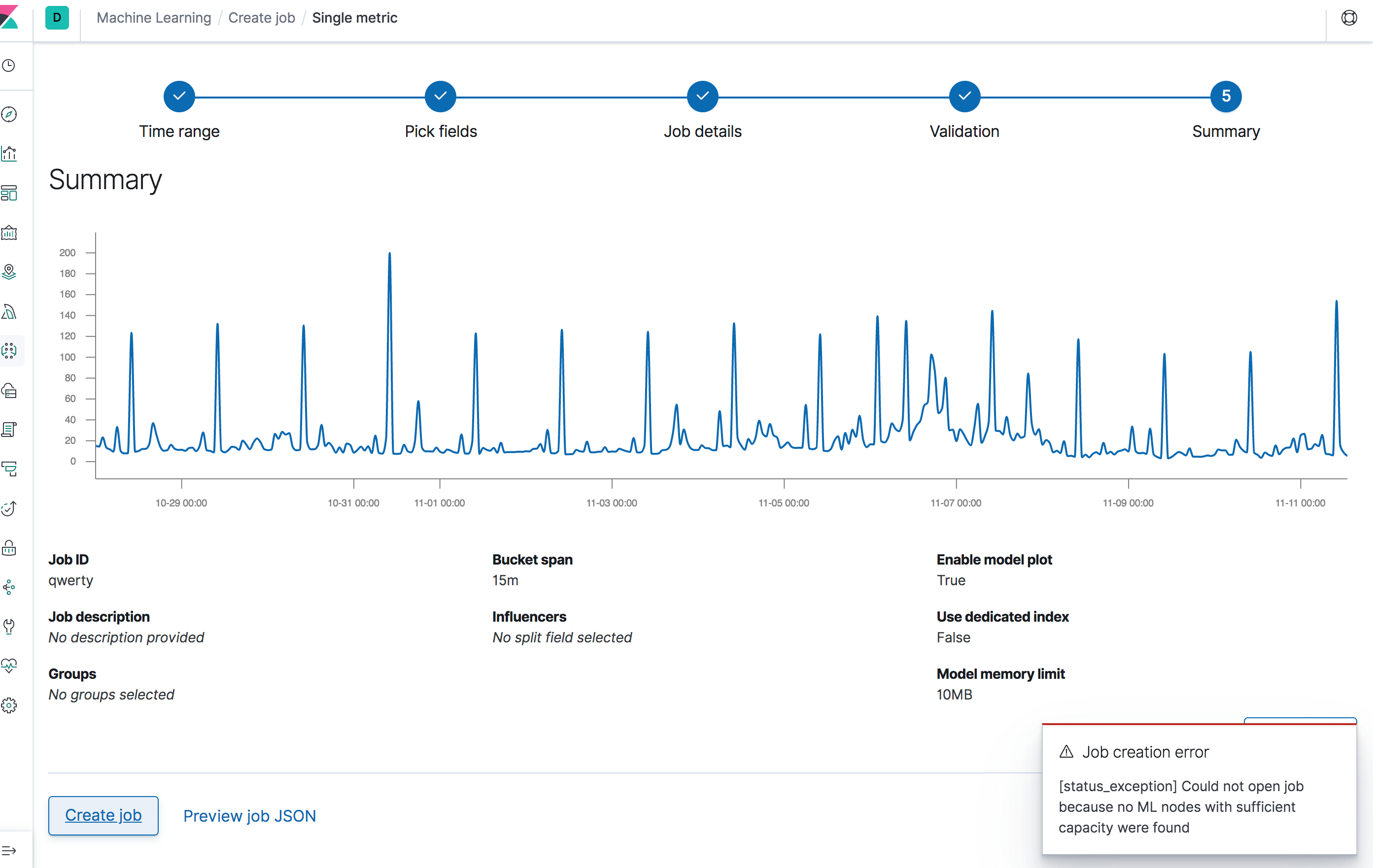 Errors returned when creating a job, opening a job, creating a datafeed or starting a datafeed are all caught and displaying in toasts.