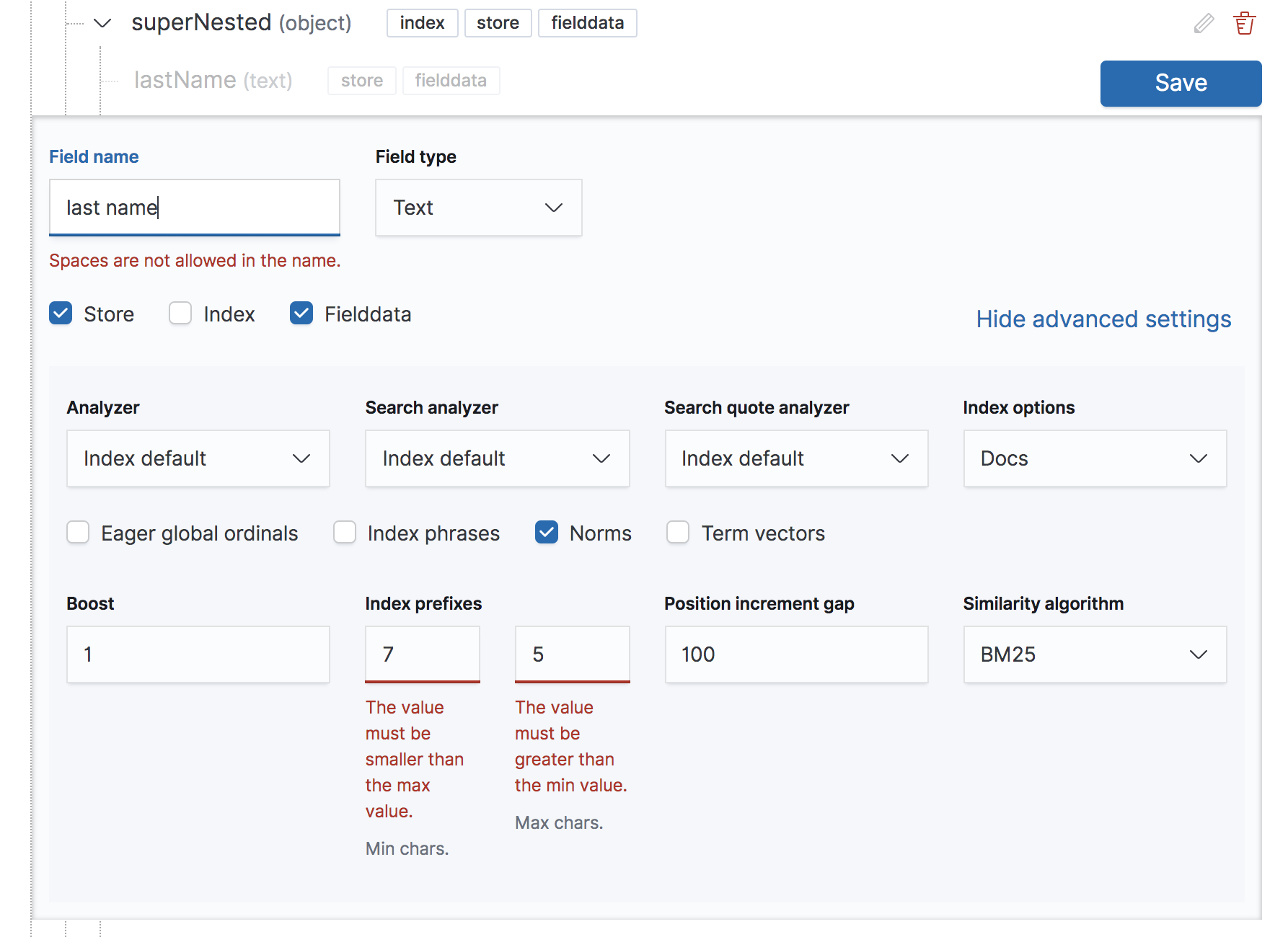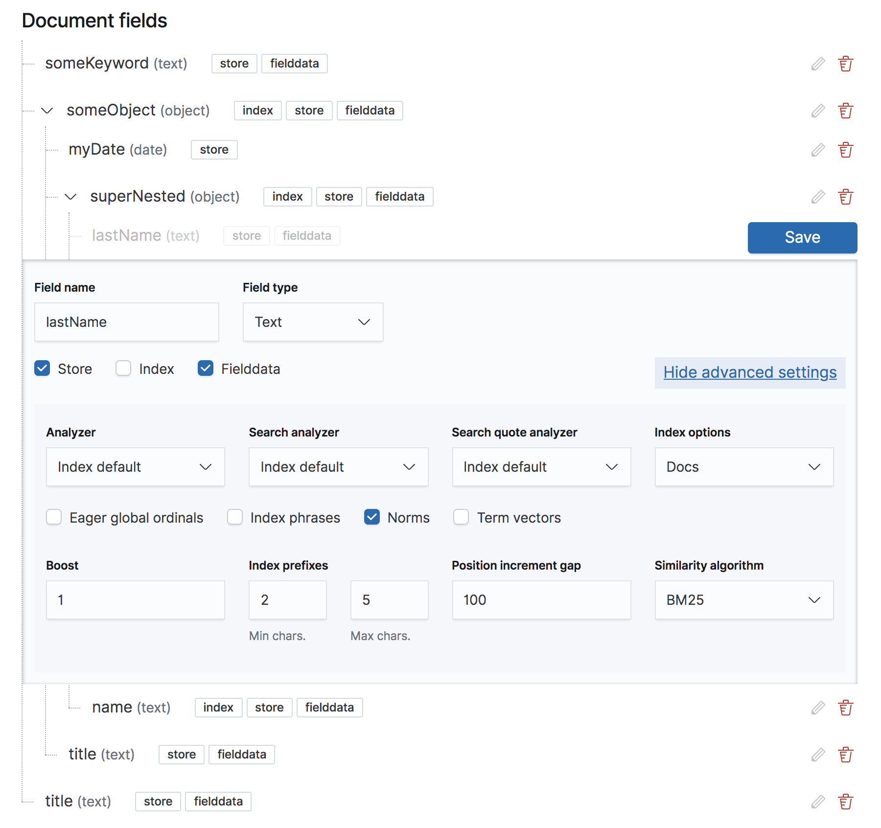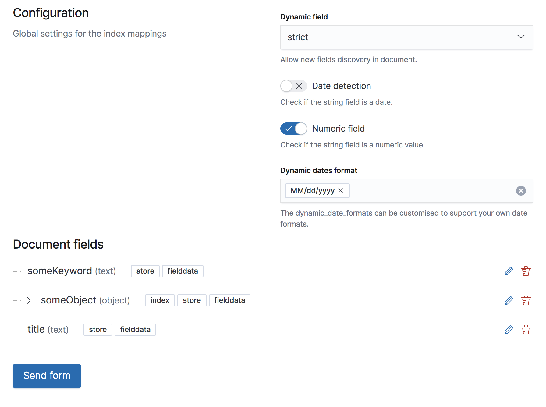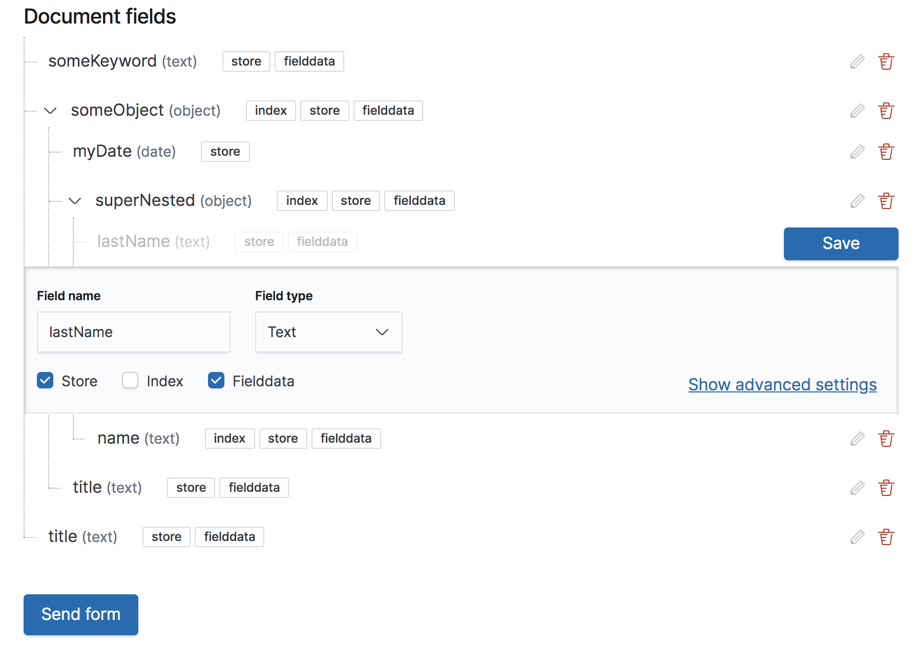 @sebelga great work. I would suggest that the save will be at the bottom right of the form so user don't need to move the mouse or lose sight when tabbing next (as the button is above his eyes focus). Instead of save should be "Done" because the user is done editing this field but not really saving the work in Elasticsearch. The send form button should be renamed to Save or OK in order to submit the form and create the mappings |
