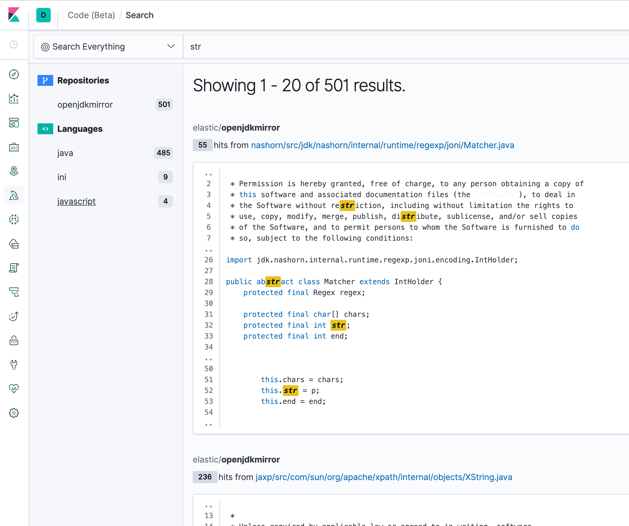 * Remove now-unused ScopeTabs component The new layout does not include these tabs; their utility is redundant with the ScopeSelector dropdown in the search bar. * Remove unused style Randomly found this orphaned rule while in here. The consuming component was deleted in a previous commit (ef8d7ea). * Use consistent block names in our BEM classes Others in this component already use codeQueryBar, so... * Move the Search bar above both the sidebar and main content * Align the search dropdown's RHS with the search sidebar This required a little coordination between the two components through a couple of sass variables. * Remove erroneous width rule This was incorrect for two reasons: * You need to interpolate the sass variable within calc * This is the same as width: auto and can be deleted * Copy: Search Filter -> Advanced Filter Also removes some odd spacing surrounding the text; that should be done with CSS instead. * Space out badge with margin, not nbsp The copy previously had a leading space; using margin is a better approach. The class that was replaced was unused. * Fix alignment of Filters flyout badge This tweaks the pink badge to be aligned with the text on the flyout title. Also removes a now-obsolete className (code-flyout-title). * Adjust layout of Search filter sidebar * Indents facets below the filter's title * Adjusts spacing to be more consistent, removes use of EuiSpacer NB there's a bit of a hack for the indentation itself: we use an empty, fixed-width div for the facet's icon prop. * Fix newline errors These were introduced by some default vscode settings, which have now been resolved. * Update snapshots following markup changes * Less hacky way of indenting facet buttons Rather than use an empty, fixed-width div as an icon, just give it some margin-left. * Swap hardcoded rem values for equivalent eui vars * One more eui var replacement * Remove unused import * Remove unused translations These existed in the ScopeTabs component which has been deleted.