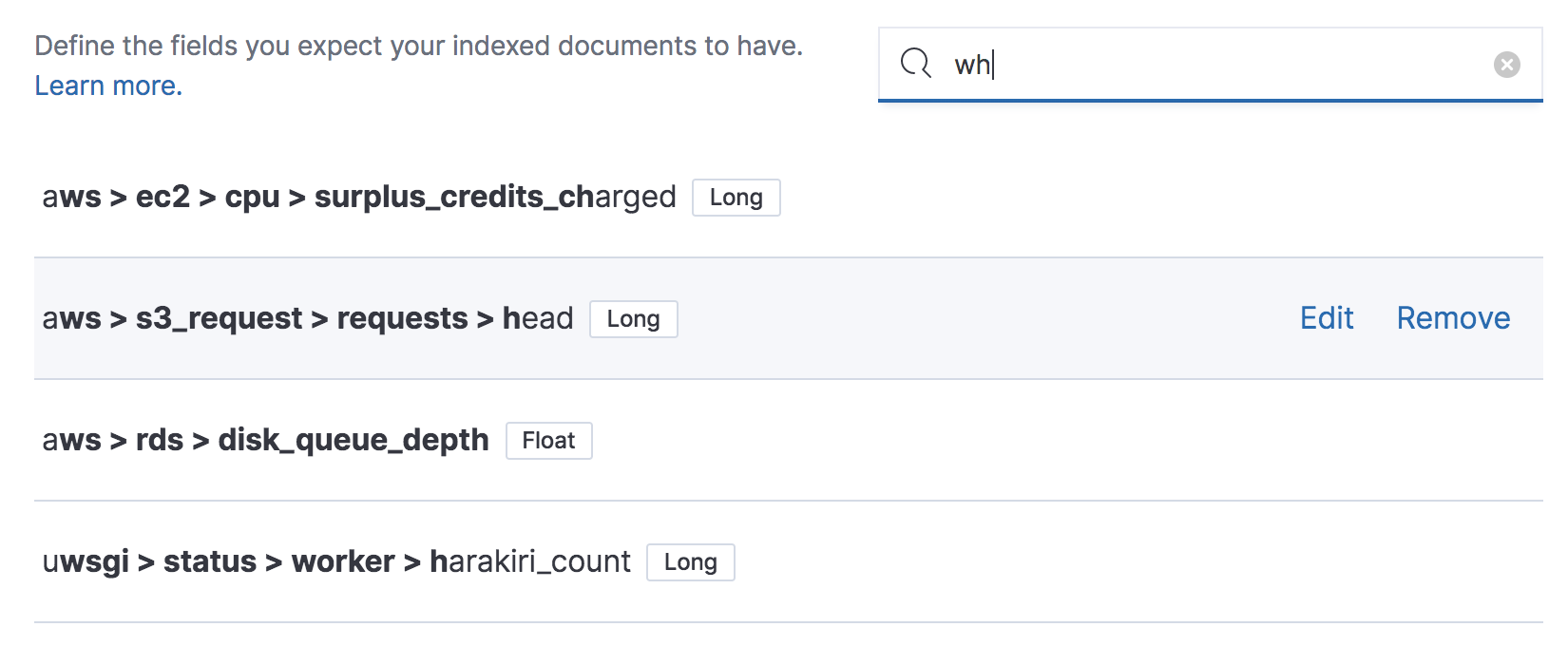 The search functionality goal is for a user to be able to find a field and either "Edit" it or "Remove" it.