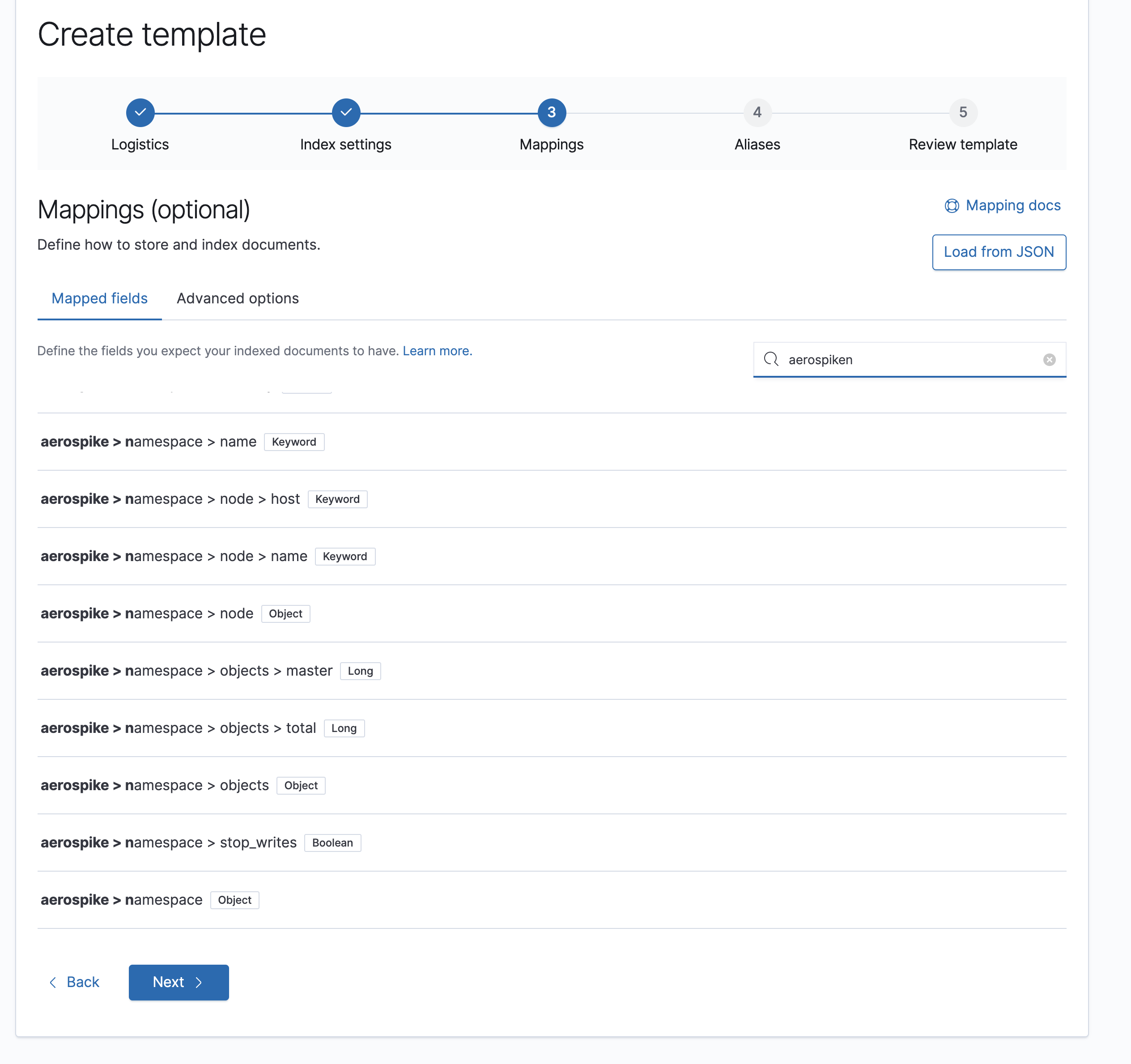 It seems like a bug on the "Load JSON" functionality (not related to search). I will look into it tomorrow. You mean that if we only load a mappings "properties", the old advanced configuration are kept, is that it? |