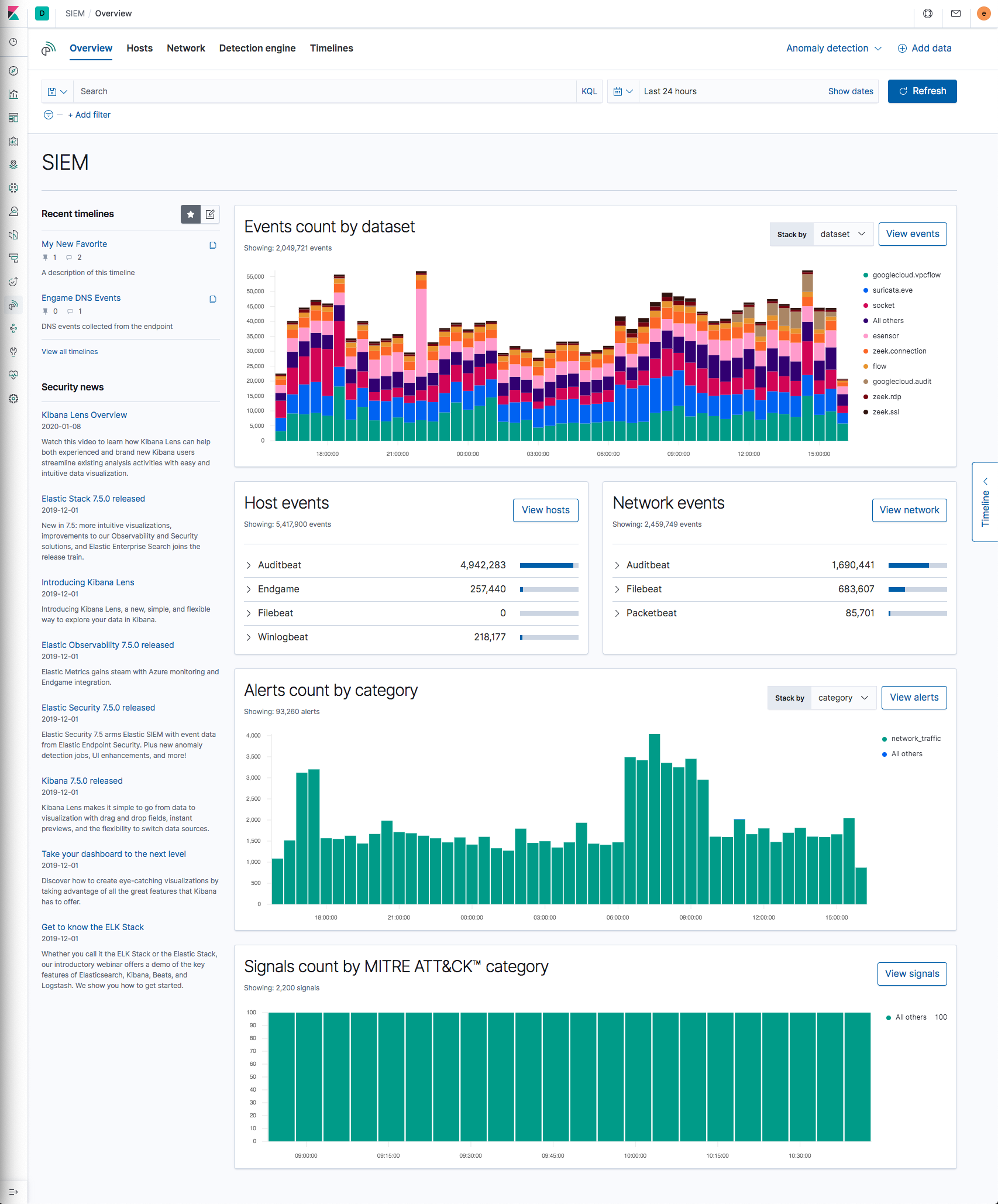 …Security news` feed, visualizations, and rolled-up event counts   - Added the global Search bar and Date picker to the Overview page - New `Recent timelines` widget affords quick access to favorite and recently modified timelines - New `Security news` widget - New Kibana advanced settings (toggle switch) for enabling or disabling the news widget and configuring the news URL  - New `Events count by dataset` widget - Updated the `Host Events` and `Network Events` widgets to integrate with the Search bar and date picker input - Enhanced the `Host Events` and `Network Events` widgets to use an accordion paradigm that summarizes stats by source (e.g. `Auditbeat`, `Endgame`) - Enhanced the `Host Events` and `Network Events` widgets to visualize relative percentages of events collected as progress bars - New `Alerts count by category` widget - New `Signals count by MITRE ATT&CK™ category` widget - New `View events`, `View alerts`, and `View signals` navigation buttons for their respective visualizations - FTUE "no data" view design refresh  - When the FTUE "no data" page is displayed, hide all global navigation links (i.e. `Hosts`, `Network`, `Detection engine`), such that only `Overview` appears in the global nav - App Help popover design refresh  - Removed the `Beta` badge and `Security Information & Event Management with the Elastic Stack` from the Overview header - Tested in Chrome `79.0.3945.117`, Firefox `72.0.1`, and Safari `13.0.4` - The `siem:newsFeedUrl` advanced setting is defaulted to `https://feeds.elastic.co/kibana` - The `Signals count by MITRE ATT&CK™ category` visualization does not display all categories - The `Signals count by MITRE ATT&CK™ category` visualization may require a different index pattern - `EuiButtonGroup` throwing a `Can't perform a React state update on an unmounted component` warning when switching from the Overview tab elastic/siem-team#484