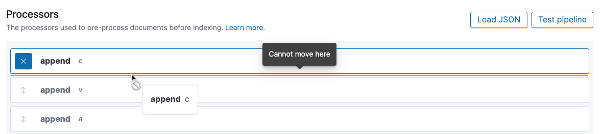 There's a lot of visual feedback in the screenshot below: a grayed-out drop indicator, a "Cannot move here" tooltip, a "Blocked" cursor, and the new processor tooltip. It's a lot to take in! Too much, I think.