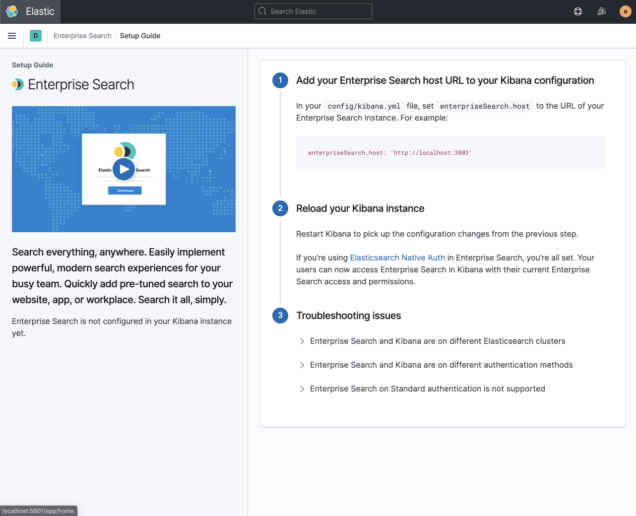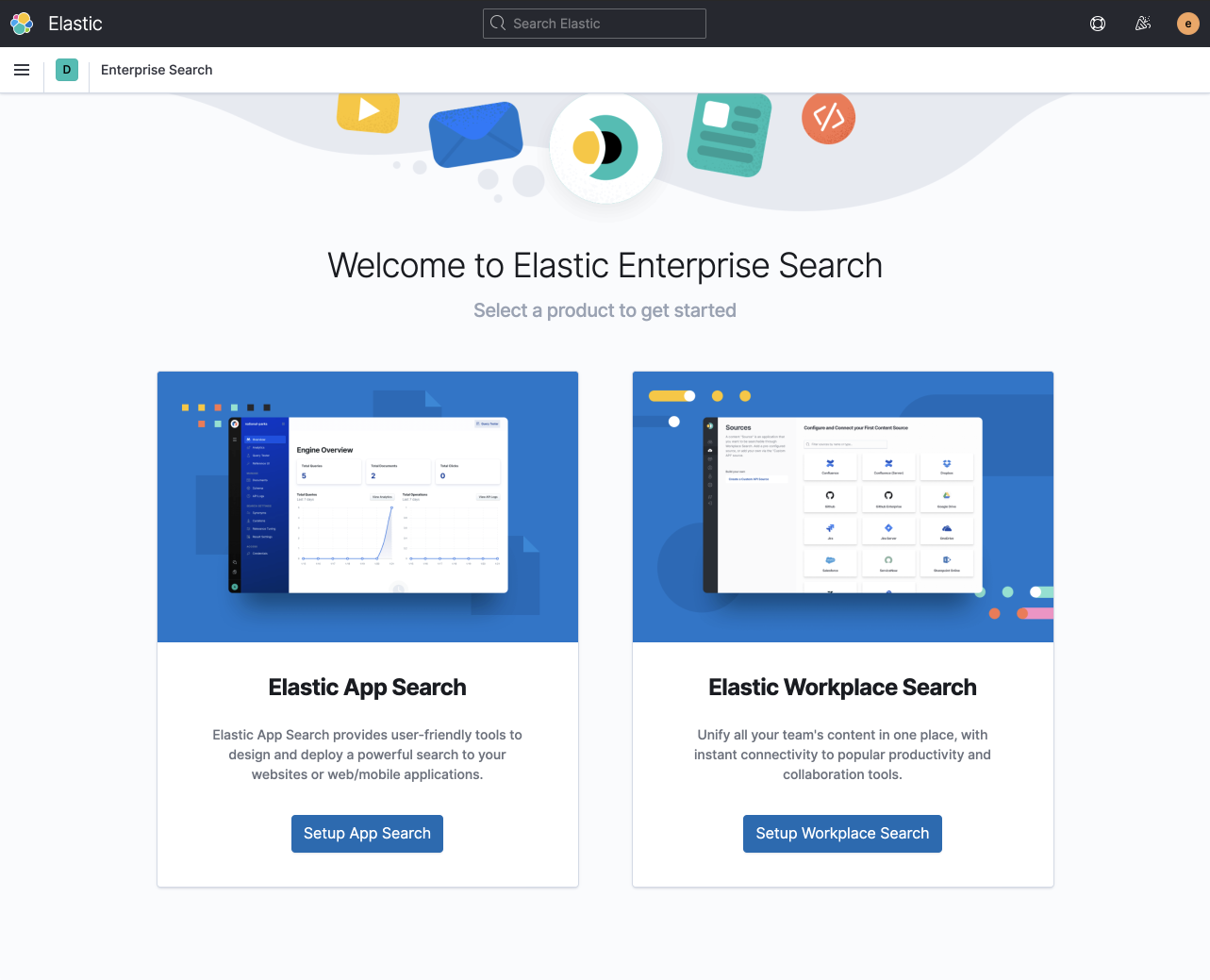 enterpriseSearch.hostset in the kibana.dev.yml file and visit the Enterprise Search Overview page. Links should say Setup Workplace Search and Setup App Search and link to the setup guide.enterpriseSearch.hostset in the kibana.dev.yml file and make sure Enterprise Search is not running. Visit the Enterprise Search Overview page. Error connecting page should render and button should take you to Enterprise Search setup guide.enterpriseSearch.hostset in the kibana.dev.yml file and make sure Enterprise Search is running. Visit the Enterprise Search Overview page. Product selector should be shown with links that say Launch Workplace Search and Launch App Search and link to the product overview pages.Checklist