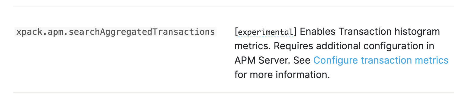 xpack.apm.searchAggregatedTransactionsand links to APM Server's (soon to exist) Transaction metrics page for more information. This setting is marked as experimental.