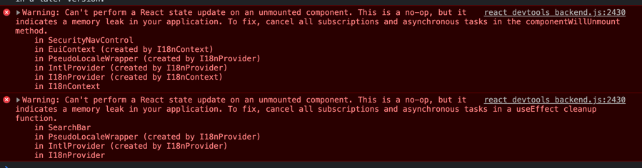 There was an issue where the console was giving unmounted component errors introduced here. Changing the order of the hiding of the Chrome removes the issue. Not sure why hiding the chrome before the data was fetched caused this but I can't seem to get the error to happen again with this order.
