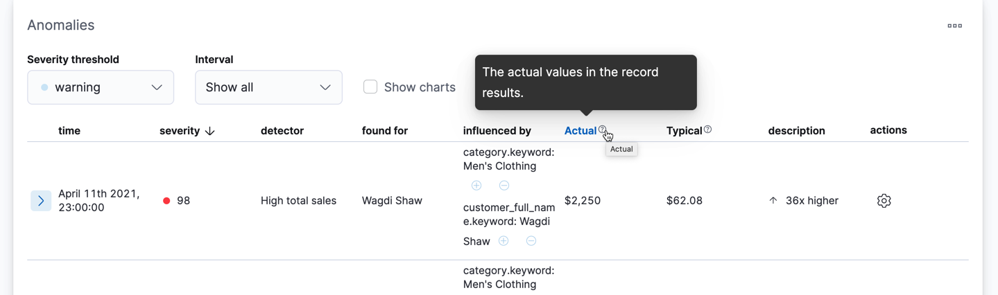 This PR adds tooltips for the "Typical" and "Actual" columns in the machine learning anomaly detection results table.