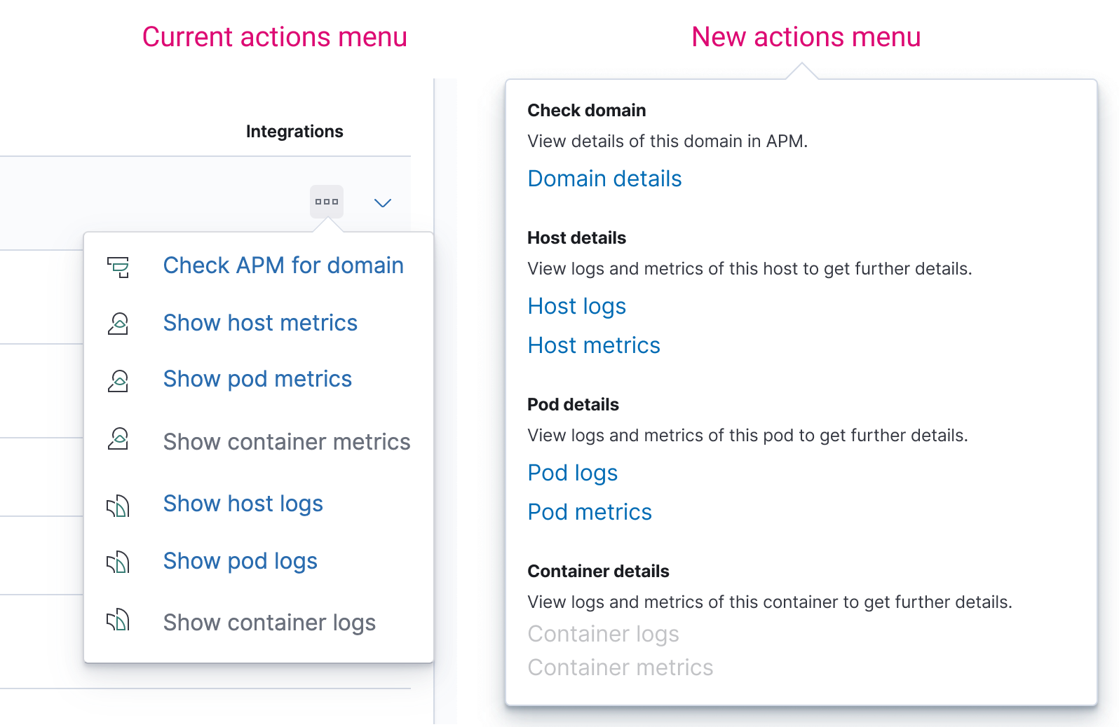 The current actions menu (holding links to other solutions) is overwhelming and hard to grasp/read. Furthermore, we have this kind of menu all over observability - but not consistent.