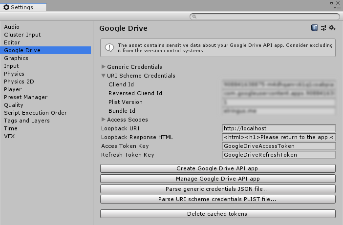 - Return to Unity editor, open Google Drive settings and click Parse URI scheme credentials PLIST file; select the downloaded credentials plist file;