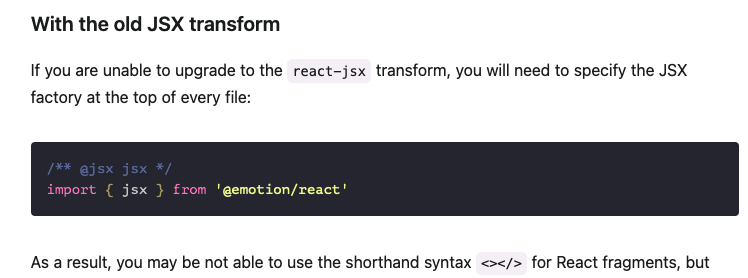 @jsxpragma from all of the code samples because, some of those are live examples and the pragma was messing them up, and also I want the docs to be focused on thereact-jsxtransform which does not require the pragma. - I think the Emotion docs could be improved by adding an "Integration Guides" heading to the navigation menu on the right. It would be below the "Advanced" heading. The nav items under the new heading would be "Create React App / CodeSandbox", "Next.js", .etc. If you would like to work on this, I can create a new issue and reach out to Andarist for approval.