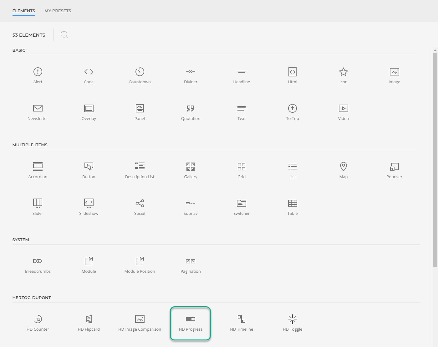 - copy the complete folder hd-progressinto the directory/templates/yootheme_child/builder/(Joomla!) or/wp-content/themes/yootheme-child/builder/(WordPress) of your installation while child must be the name of your child theme