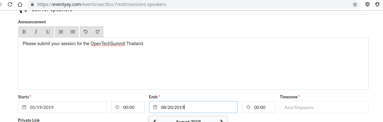 Creating a call for speakers does not work properly. The text and the dates are not stored correctly. Trying several times will finally store the correct value, but it does not always work right away.