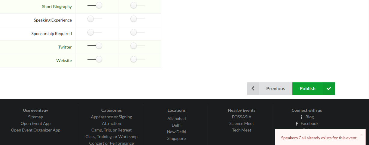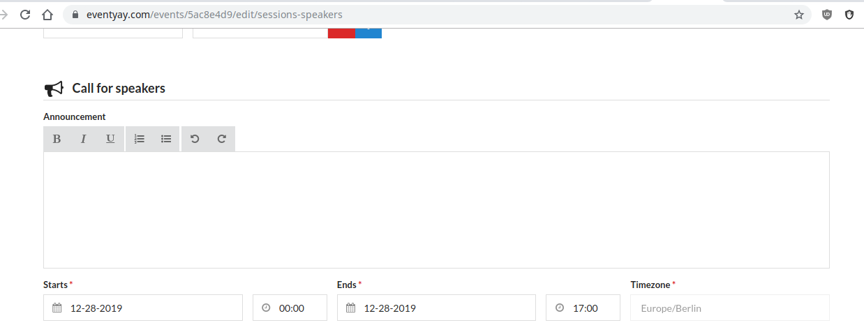 In Wizard step 4 I regularly experience that the "Speaker's Call" field is empty when editing an existing Call for Speakers even though field was formerly filled in. When saving "publish" the system shows an error message. Trying to close and go to the wizard step 4 again results in the showing up of the text again (at times).