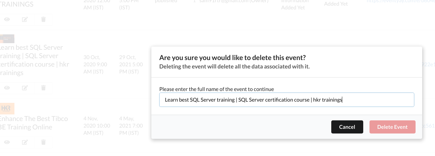 Even if the admin enters the name of a spam event such as "Learn best SQL Server training | SQL Server certification course | hkr trainings" the spam event is not deletable.