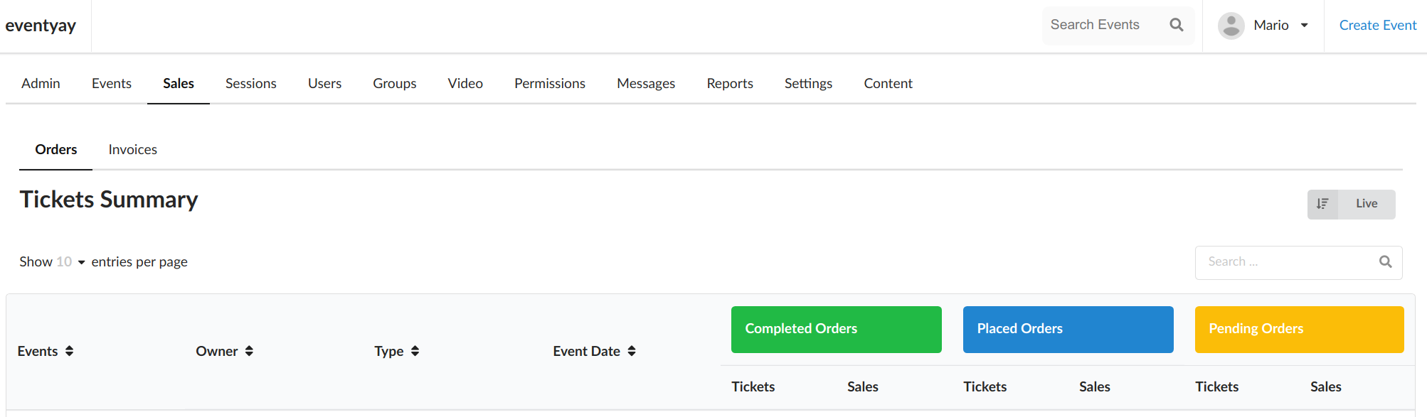 On the tickets summary page on https://eventyay.com/admin/sales/live please add an option to export the table as a CSV. Additionally include the following as columns in the CSV: * Owner Names * Names and Emails of other organizers * Event Creation Date