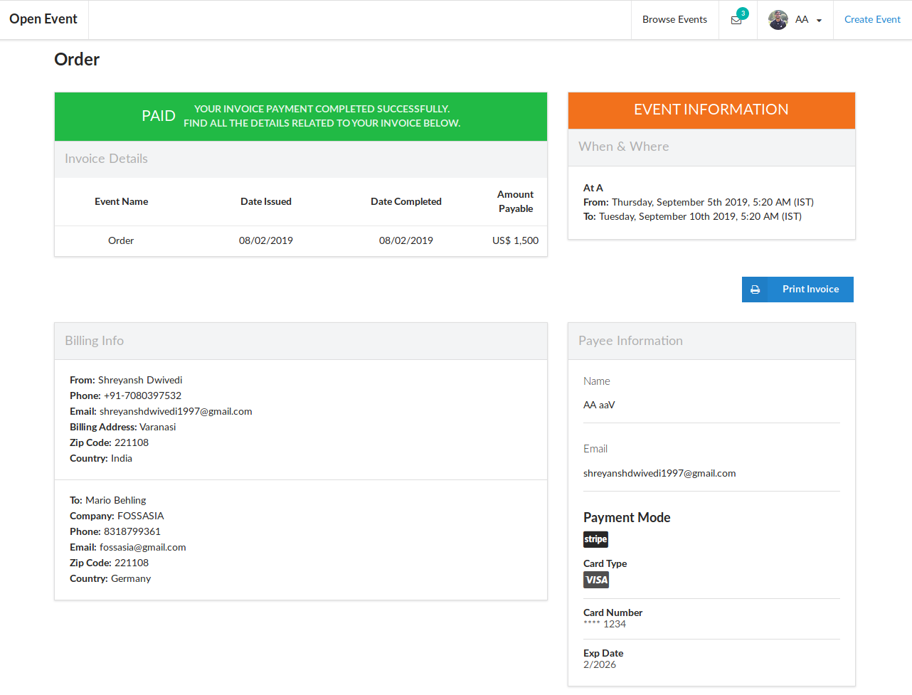 As soon as the event invoice payment has been authorized & becomes successful, the user must be redirected to the route where he can view the paid payment for the invoice.