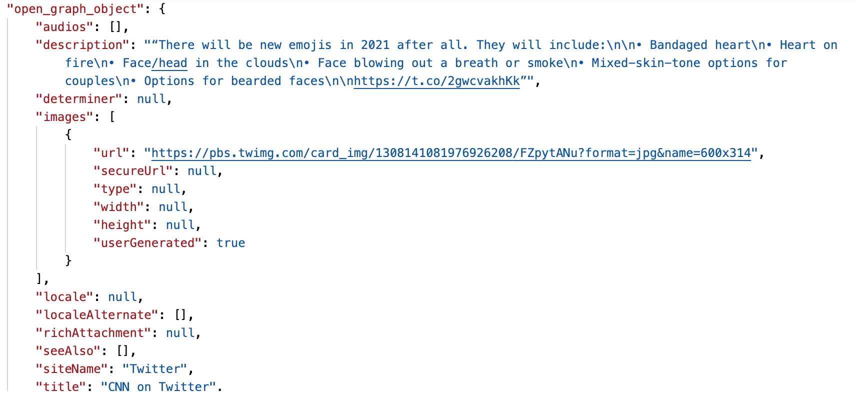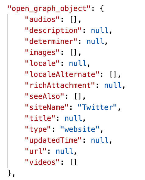 Attached are screenshots of the open graph data that gets returned when the following url is passed: https://twitter.com/CNN/status/1308170698175774720. The first screenshot is the result without a user-agent and the second screenshot is the result with the user-agent mentioned above.